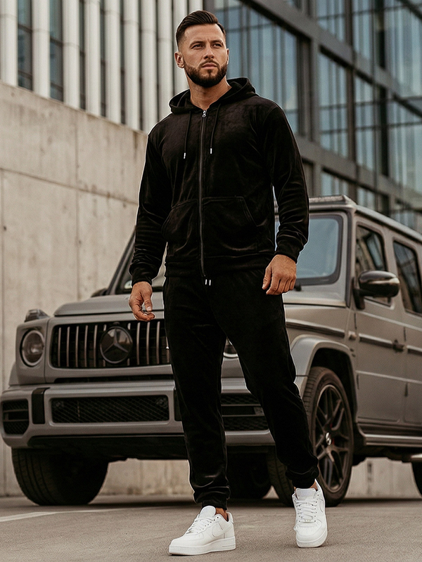 Fekete színű velúr férfi melegítő együttes kapucnival Bolf 0002A