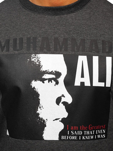 Kényelems antracit színű férfi pulcsik a Bolftól, a sportguru Muhammad Ali nyomtatott képmásával. Antracit színű mintás pulcsi, viseld joggerrel, rövidnadrággal az edzéseken. A hétköznapokon viseld casual stílusban, farmerral, streetes baggy nadrággal.