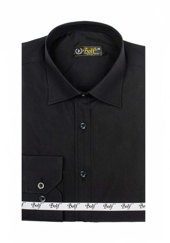 Fekete színű, elegáns, hosszú ujjú férfiing - Bolf 1703 - nem csak az elegáns férfiak szekrényében kötelező darab. Ez a modell számos, többé-kevésbé intenzív színben is kapható, így számtalan casual és smart stílusú ruhával könnyen összeilleszthető. Az inget kifejezetten a minimalista divatirányzatok rajongóinak számára ajánljuk. Kényelmes, szépen varrott. Egy feltétlenül kötelező ruhadarab a tudatos üzletember ruhatárában. Az egyszerű, klasszikus, érdekes színű fazonjának köszönhetően ez az ingmodell nagyszerűen kiegészít számos hétköznapi stilizációt. Testhezálló slim fit ing, gombolható, kerekített alsó résszel rendelkezik. Az ujjai széles, állítható mandzsettával vannak ellátva, egy gombbal zárhatók. Klasszikus gallér, rövid lecsapott véggel.