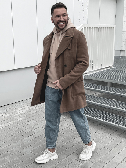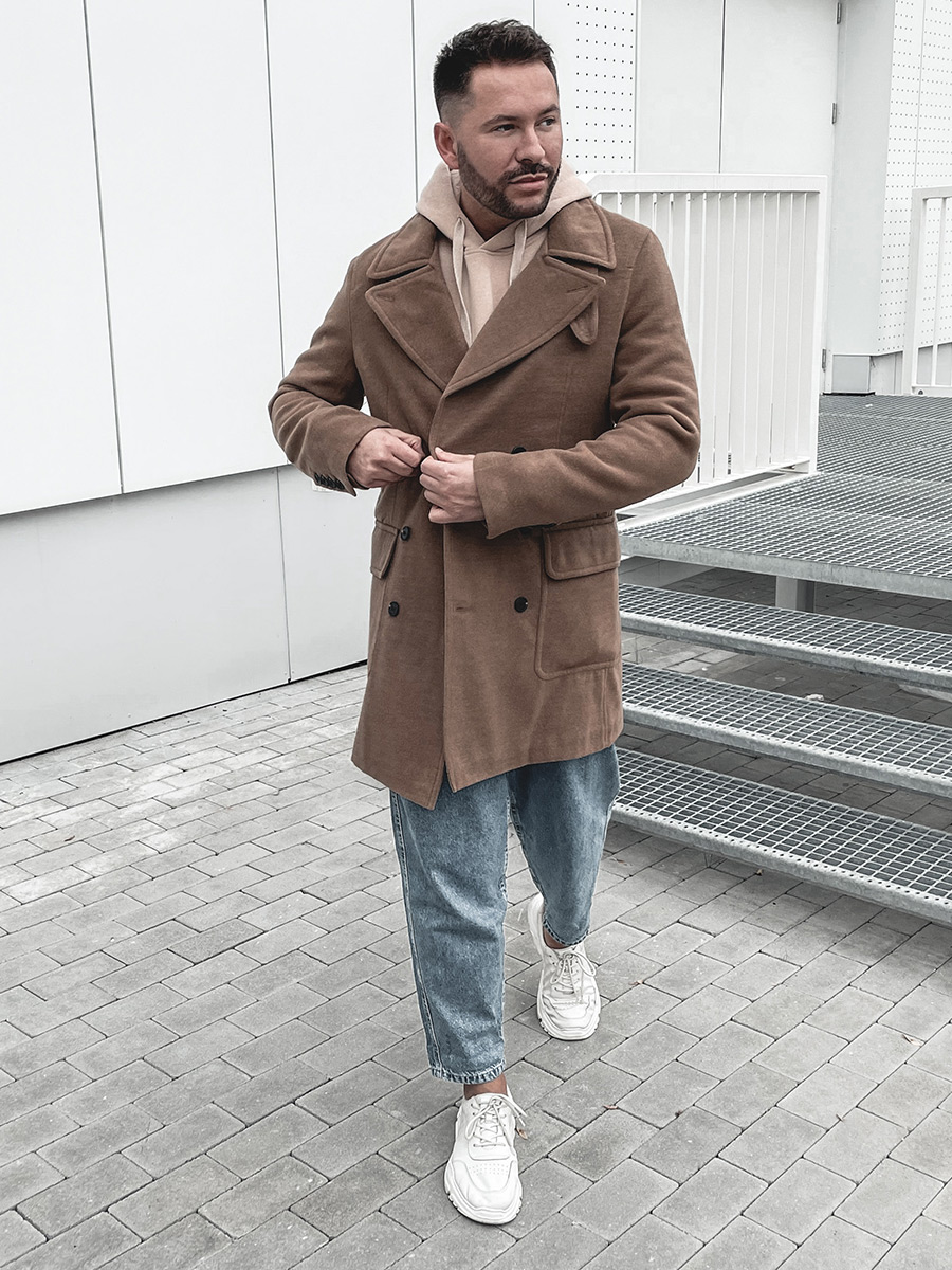Camel színű téli kabát> 1048B. Kétsoros, bélelt, gombos modell. Kabát revers gallérral, két belső zsebbel, lehajtható füllel takarva, patentos és egy belső gombos zsebbel. A kabát további aduja még a dekoratív gombok az ujjak végén. Nagyszerűen alakra szabott, karakteressé teszi a stilizációt.