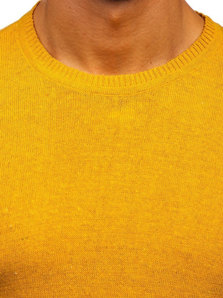 Sárga férfi pulóver 0001. Belebújós, kerek dekoltázsú modell, szűkítővel az ujjakon és az alsó részen. Pulóver, egyszerű, klasszikus szabású, finom varrásokkal, egy must have darabja a férfi ruhásszekrénynek. Meleg, finom, kellemes tapintású anyagból, amely ideálisan idomul az alkathoz.