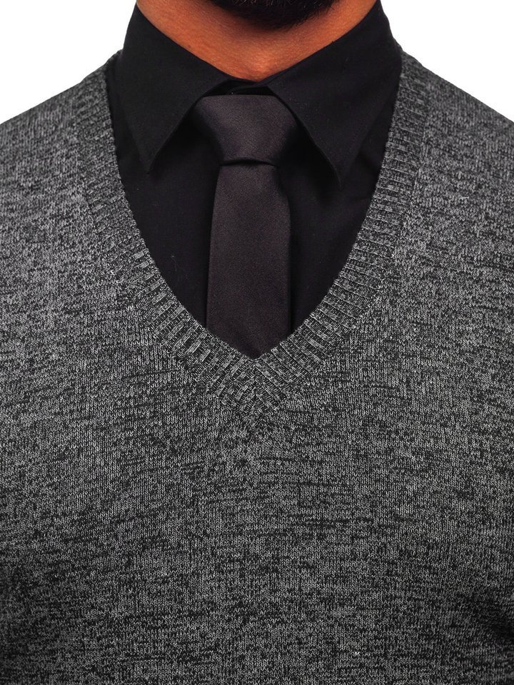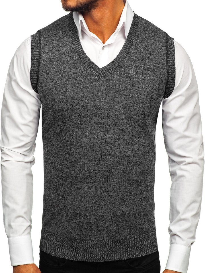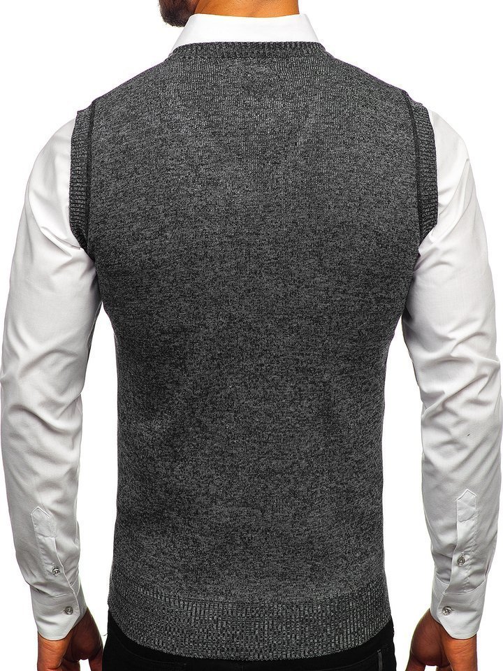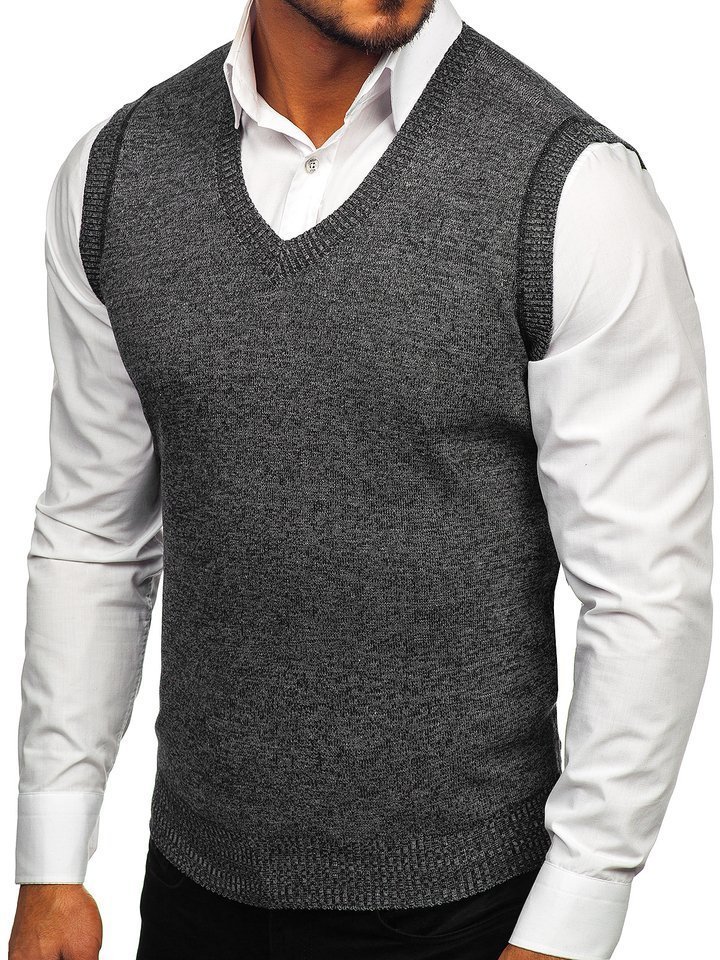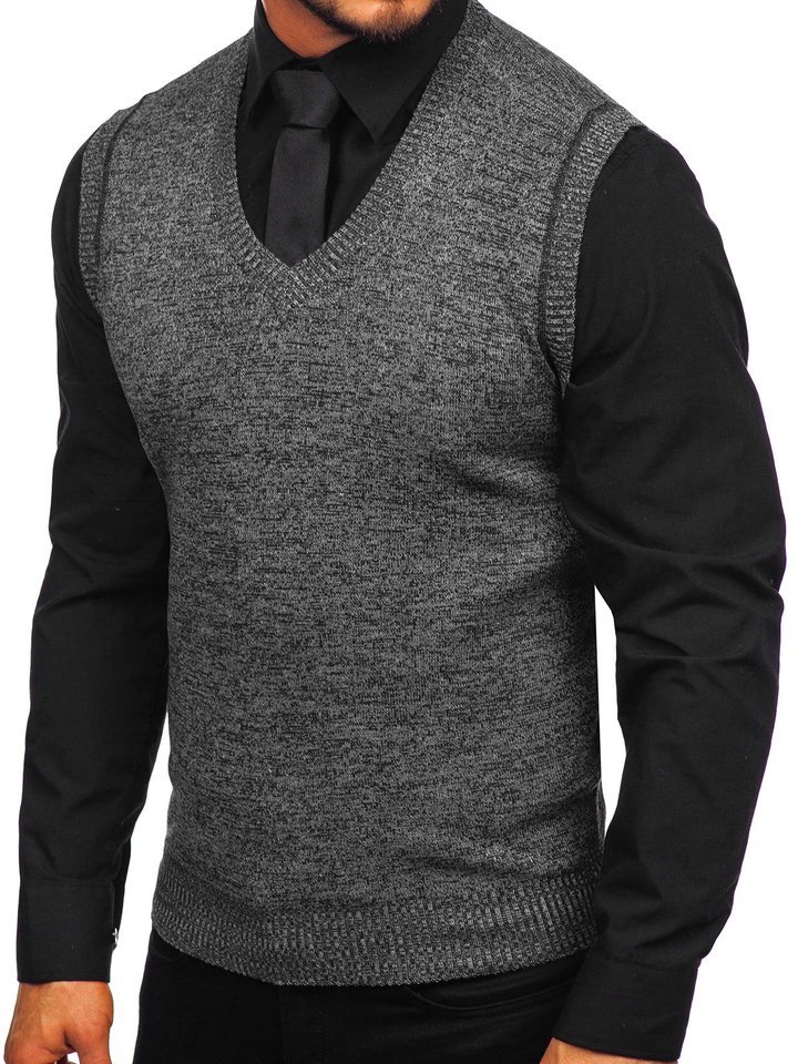 Stílusos, fekete, ujjatlan, férfi pulóver a Bolftól. Nagyszerűen alakra szabott, divatos és kényelmes. Fekete v-nyakú pulóver, nagyszerűen mutat klasszikus inggel. A hűvös napokon használt zakóval is.