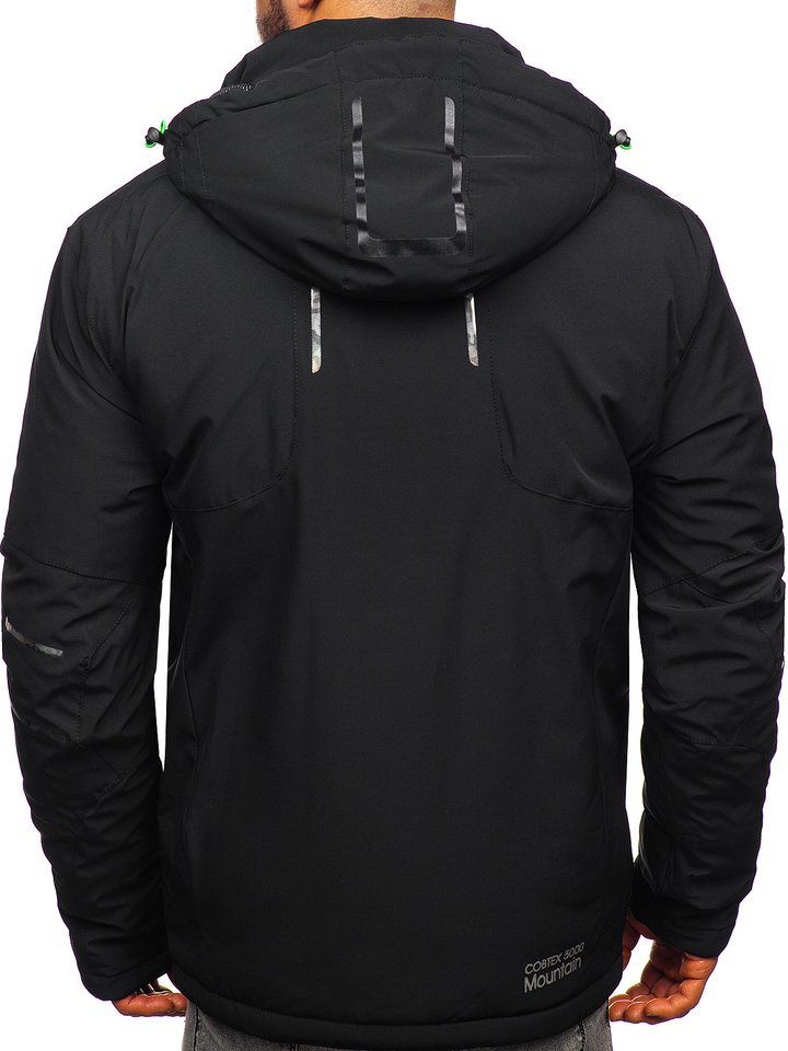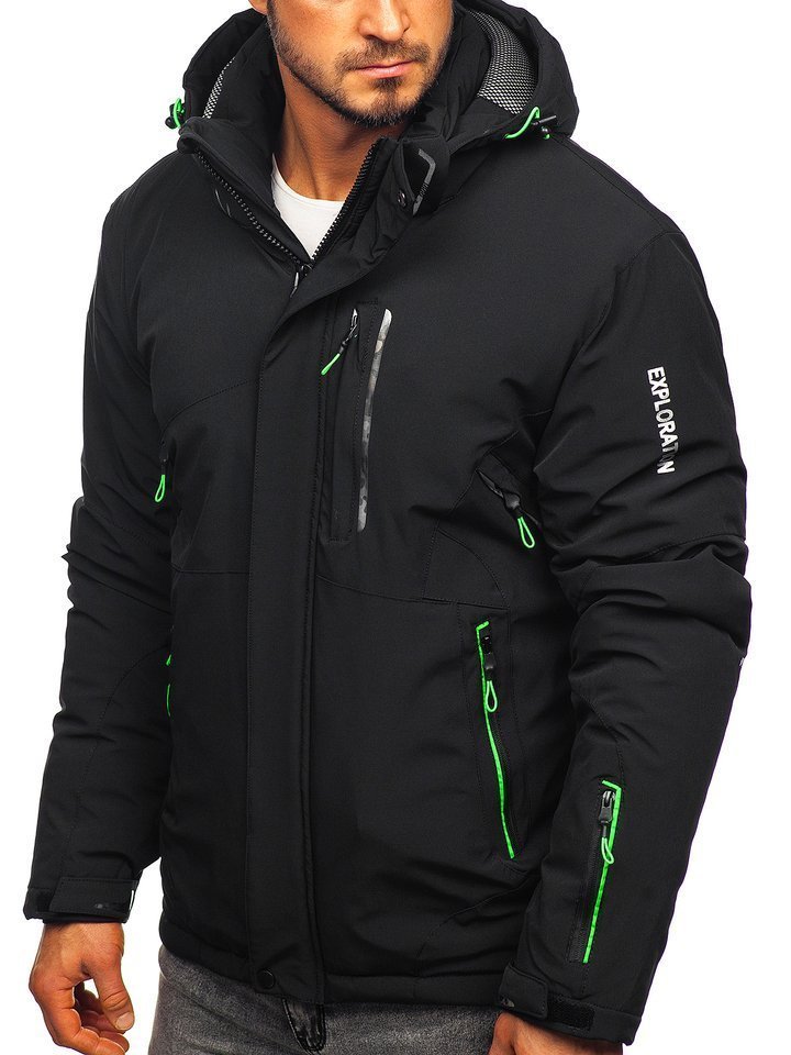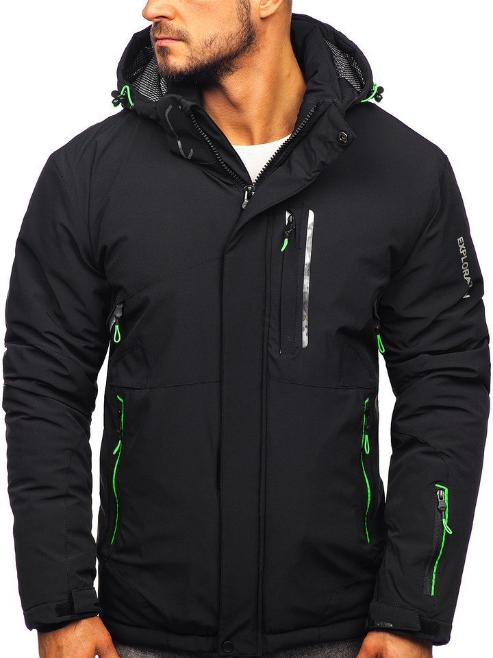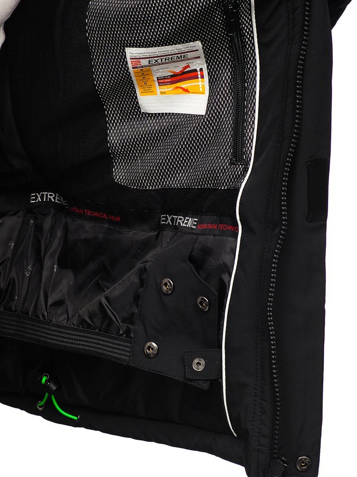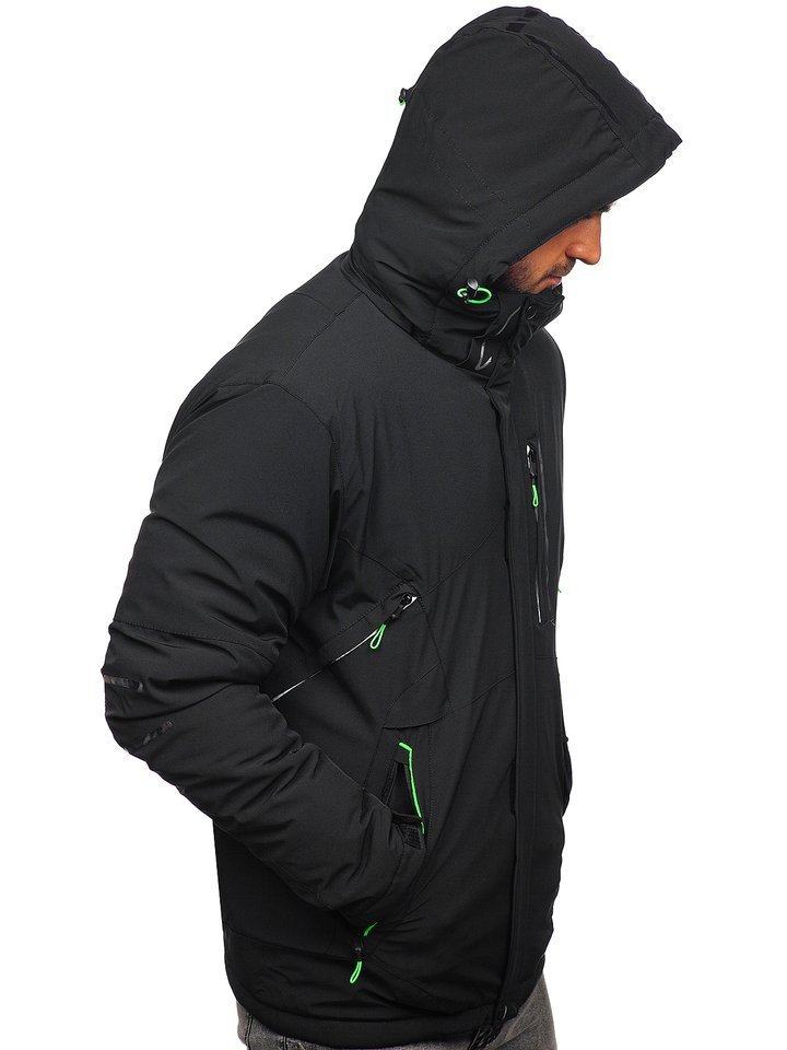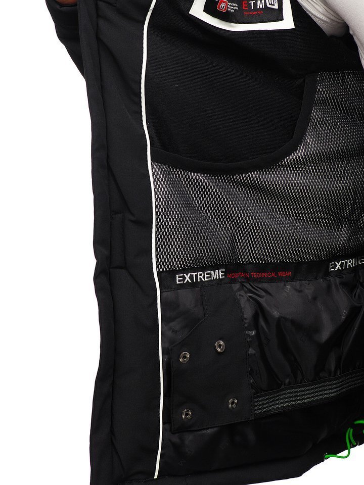 Férfi téli sídzseki fekete-zöld 1910. Különösen praktikus megoldásokkal rendelkező termék, mint a cipzárral és patenttal zárható állógallér, az állítható és levehető kapucni, oldalsó szellőzők, belső telefontartó zseb, passzés ujjak, cipzározható külső zsebek és a napóleon típusú mellzseb. Jellegzetessé a dzsekit a berakások teszik kontrasztos zöld színben és nyomattal az ujjakon. Sídzseki ideálisan mutat a téli sportrekreációk alatt. Nagyszerű védelmet biztosít, véd a hideg és a szél elől, nem korlátozza a mozgást. Az érdekes, hasznos technológiai megoldásoknak és a klasszikus szabásnak köszönhetően a termék több szezonra is nagyszerű.