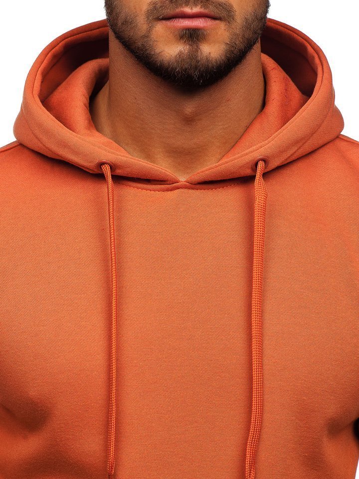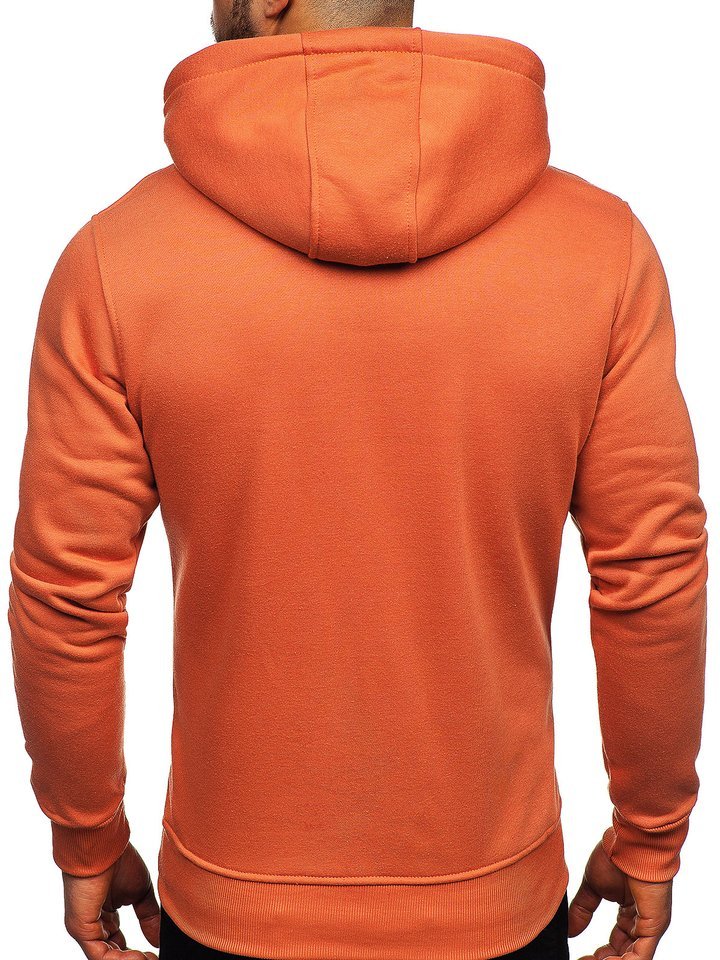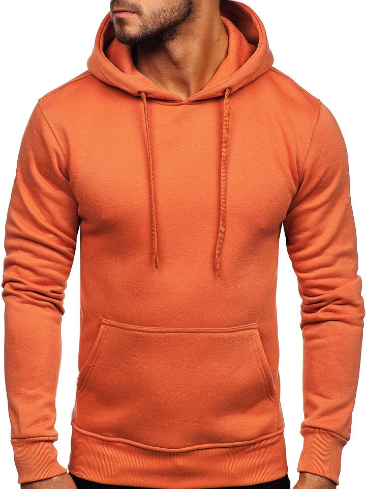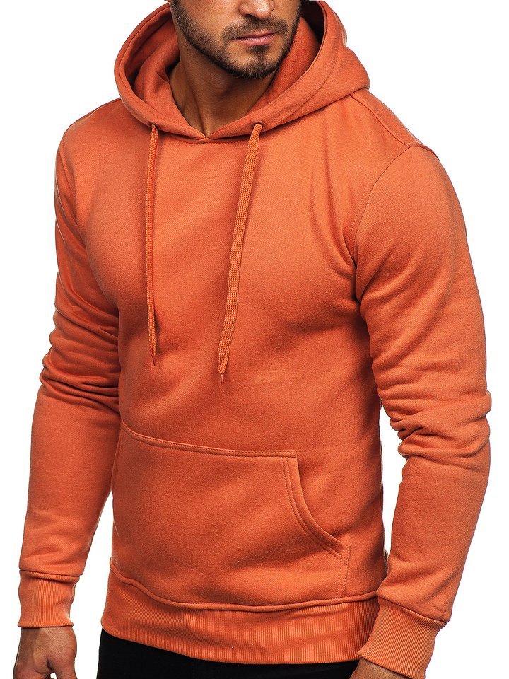 Lazac színű, belebújós, férfi pulcsi kapucnival, Bolf 2009. Az állítható kapucni és a praktikus kenguru típusú zseb jellegzetessé teszi. A sportos karakterét az egyszerű klasszikus fazon és a kiegészítések adják. A derékrész és az ujjak egyforma színű passzéval ellátva. A pulcsi puha, sima melegítőanyagból készült, ez a modell a sokszínűségével tűnik ki.