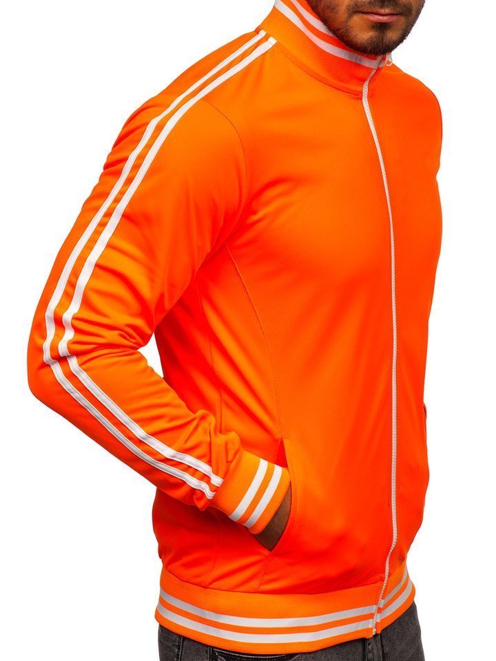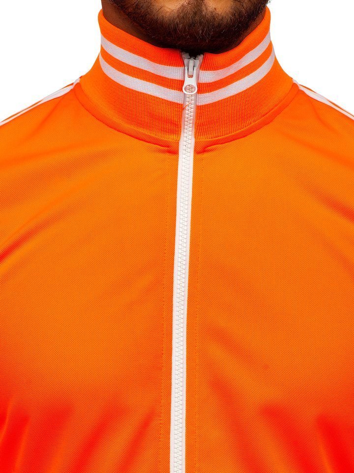 Narancssárga , nyitható, kapucni nélküli férfi pulcsi retro style 11113. Állógallérral, két oldalsó zsebbel, szűkítővel alul és az ujjakon rendelkező modell. A pulcsi dekoratív eleme a fehér cipzár és a fehér ferdepánt az ujjakon és a szűkítőn. A pulcsi érdekes színe garantálja, hogy kitűnsz a tömegből.