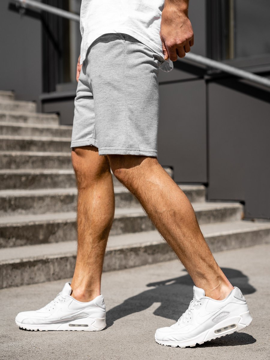 Erő a minimalizmusban. Szürke, férfi rövidnadrág a Bolftól, divatos, kényelmes és univerzális. Nagyszerűen mutat laza outfitekben sportos stílusban. Szürke, rövidnadrág könnyű pólóval, sportos cupővel, divatos pulcsival. A lookot feldobhatod siltes sapkával és kiegészítőkkel.