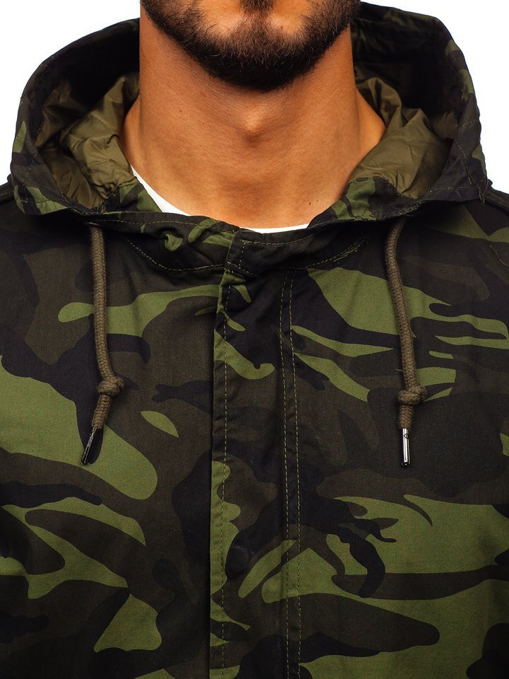 Férfi átmeneti dzseki kapucnival Bolf 5391, cipzáras és patentos. Combközépig érő, egyenes szabású.. A dzseki két külső, patentos és egy belső zsebbel rendelkezik. A derékban és a kapucnin megkötővel állítható. Az ujjak patenttal zárhatók, vállpánttal ellátva, amelyek egy kis katonai stílust varázsolnak. A khaki szín ugyanúgy megállja a helyét kifinomultabb stílusú öltözetekben, mint bátrabb színű stilizációkban.