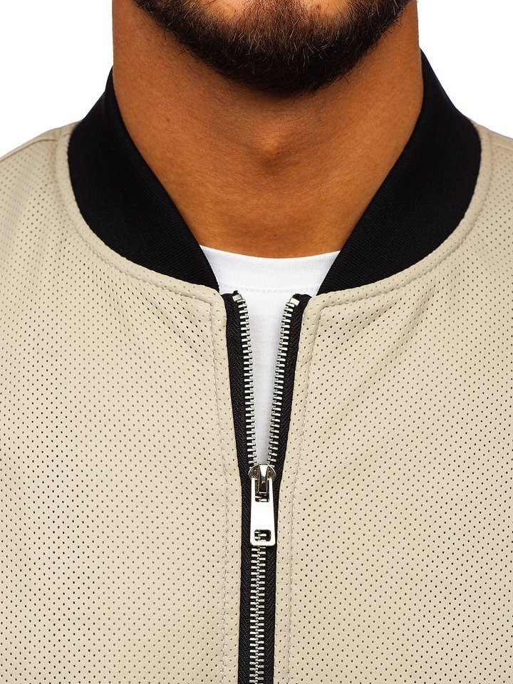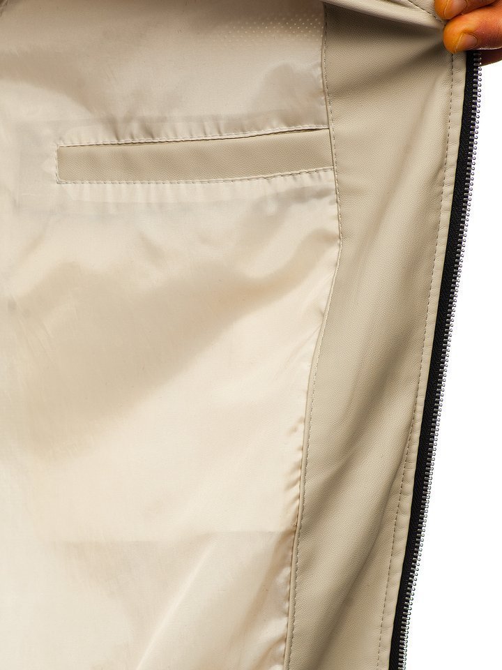 Férfi Bolf bőrdzseki 6124 ecrü színben, ami kifejezővé és feltünővé teszi. A dzseki ökobőrből készült. Cipzározható, álló típusú gallérral. Az ujjak, a gallér és a dzseki alsó része széles, fekete szűkítőkkel van ellátva. Két külső, cipzározható zsebbel és egy belső, zár nélküli zsebbel rendelkezik.