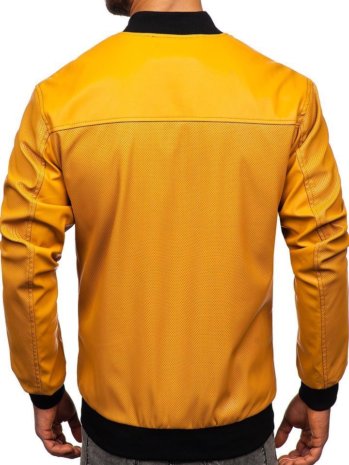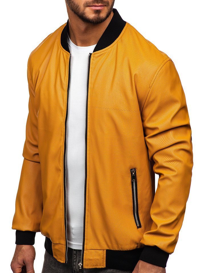 Férfi Bolf bőrdzseki 6125 camel színben, ami kifejezővé és feltünővé teszi. A dzseki ökobőrből készült. Cipzározható, álló típusú gallérral. Az ujjak, a gallér és a dzseki alsó része széles, fekete szűkítőkkel van ellátva. Két külső, cipzározható zsebbel és egy belső, zár nélküli zsebbel rendelkezik.