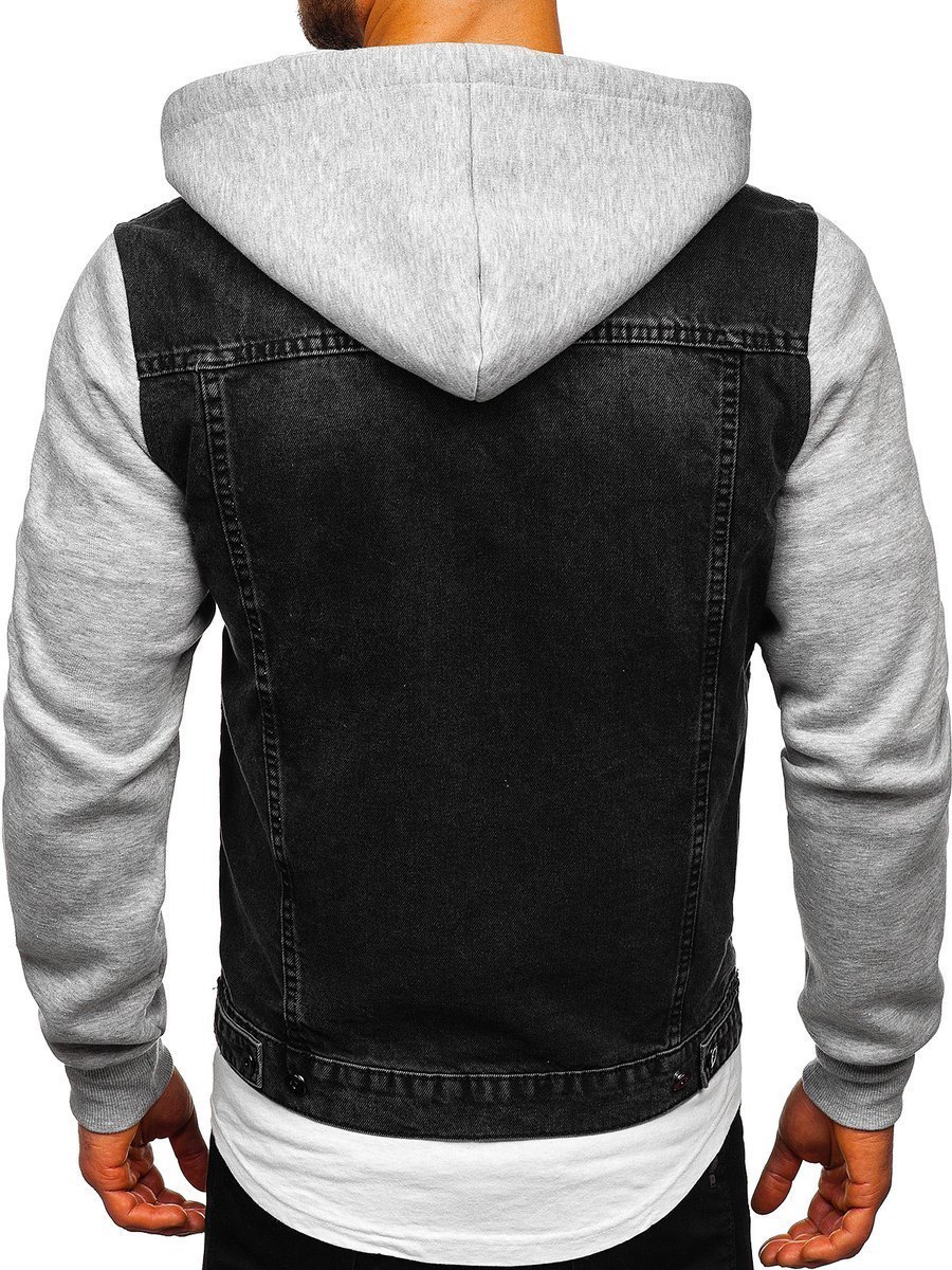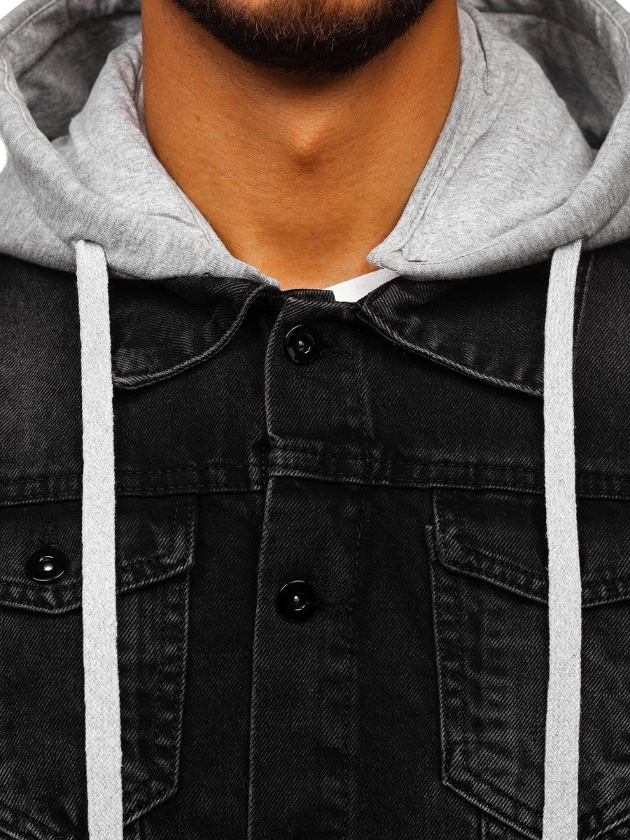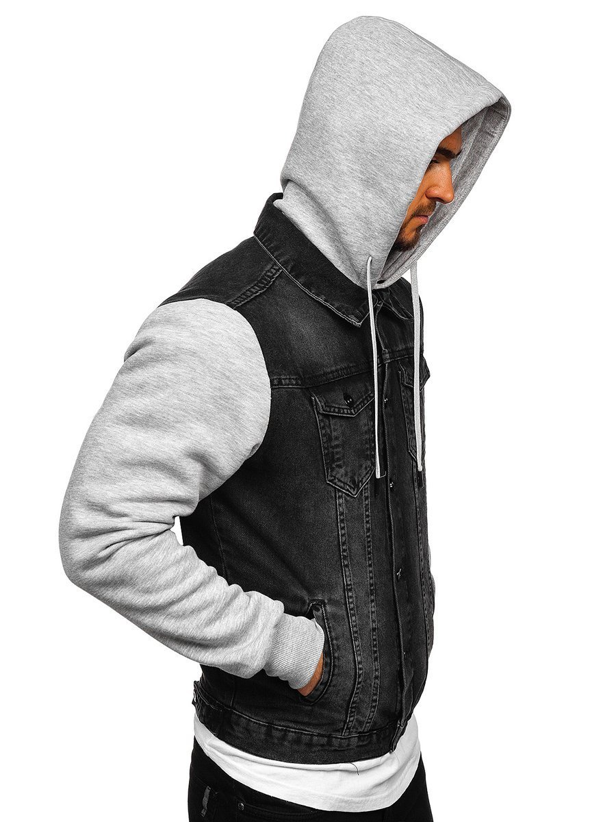 Fekete, férfi farmerdzseki Bolf 211902, kapucnival, gombolható. Alul két zsebbel zár nélkül, két gombolható, zsebfedős mellzsebbel. Levehető, zsinórral állítható kapucnival A kapucnihoz hasonlóan az ujjak is anyagból készültek, szürke színűek. Ugyanúgy megállja a helyét kifinomultabb stílusú öltözetekben, mint bátrabb színű outfitekben.