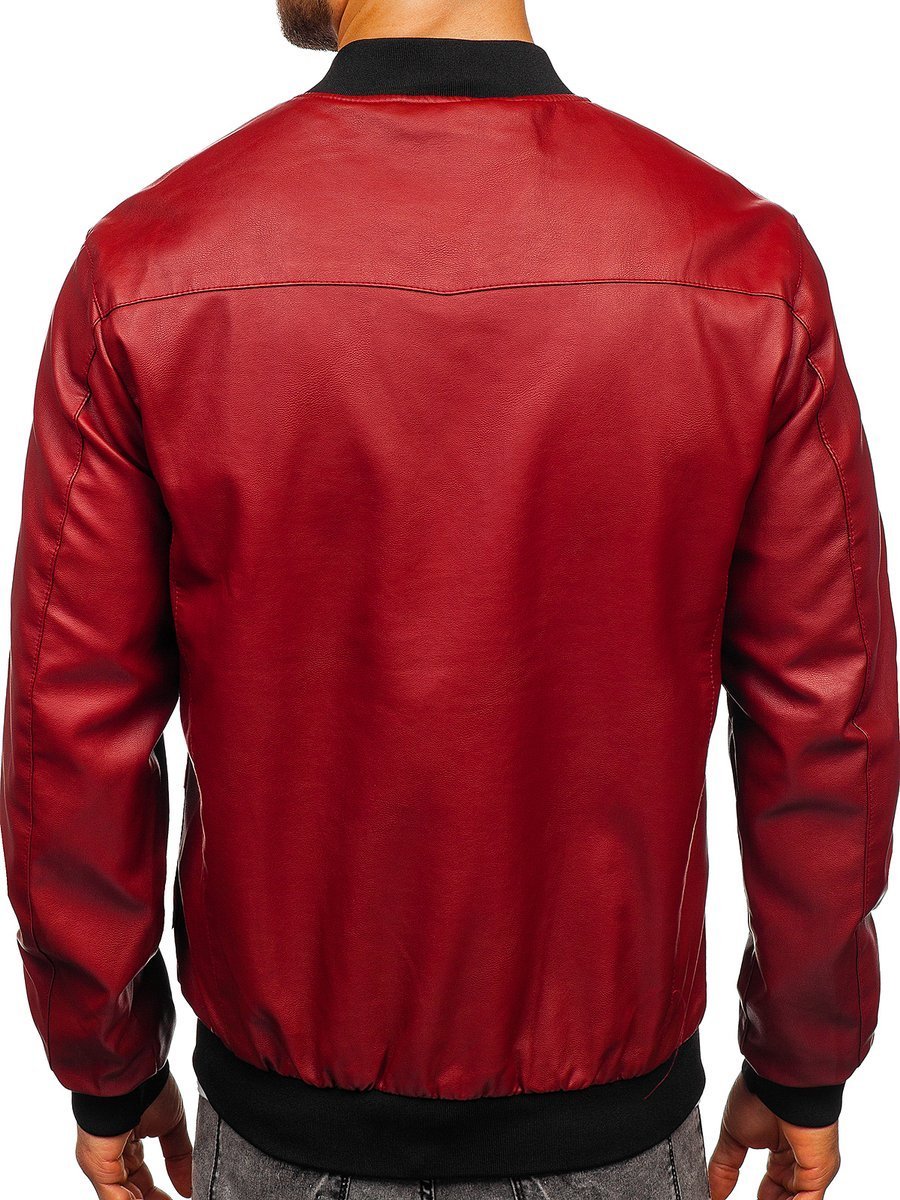 Bordó színű, férfi bomber bőrdzseki - Bolf 1147 - ajánlat azoknak a férfiaknak, akik értékelik a jó kinézetet és követik a divat trendeket. Ökobőrből készítve, a dzseki nagyszerűen illeszkedik a legújabb trendekhez. Cipzárral és kis méretű, álló típusú gallérral rendelkezik. Az ujjak, a gallér és a dzseki alsó része széles, fekete szűkítőkkel van ellátva. Bomber dzseki, két külső, cipzározható zsebbel és egy belső, zár nélküli zsebbel rendelkezik.