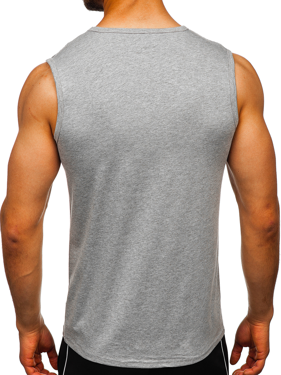 Szürke, minta nélküli tank-top - Bolf 99001 - klasszikus, egyszerű szabású. Ez a póló modell számos érdekes színben kapható, ennek köszönhetően mindenki talál valamit magának. A tank-top kellemes tapintású anyagból készült, szellős és könnyű. Mindenkin jól mutat, illeszkedik a férfi alakhoz, kiemeli az izmokat. Kerek dekoltázzsál, mely vékony, azonos színű szegéllyel végződik. Basic típusú póló, nagyszerű alap különböző stilizációkhoz.