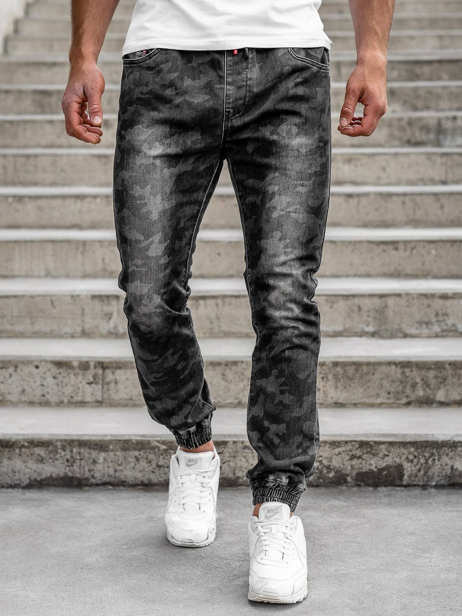 Fekete férfi jogger Bolf RB9486DT, terepmintával nyomtatott. Fekete színű, de a nyomatékos árnyékolás miatt szürkének tűnik. Jogger, szűk szabásnak köszönhetően szépen fekszik és jól idomul a férfias alakhoz, testhezálló. Széles, erős szűkítővel a lábszárakon, derékban állítható passzéval és kontrasztos piros végű megkötővel. Jogger, két-két zsebbel elöl és hátul, cipzár imitációval.
