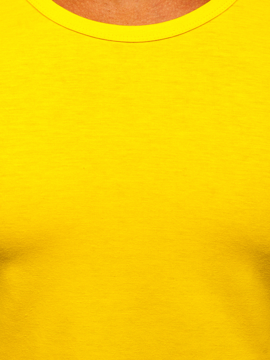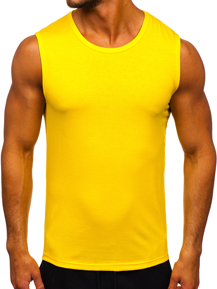 Sárga, minta nélküli tank-top - Bolf 99001 - klasszikus, egyszerű szabású. Ez a póló modell számos érdekes színben kapható, ennek köszönhetően mindenki talál valamit magának. A tank-top kellemes tapintású anyagból készült, szellős és könnyű. Mindenkin jól mutat, illeszkedik a férfi alakhoz, kiemeli az izmokat. Kerek dekoltázzsál, mely vékony, azonos színű szegéllyel végződik. Basic típusú póló, nagyszerű alap különböző stilizációkhoz.