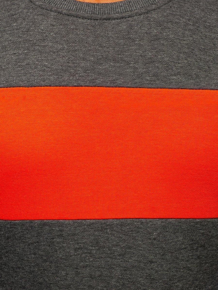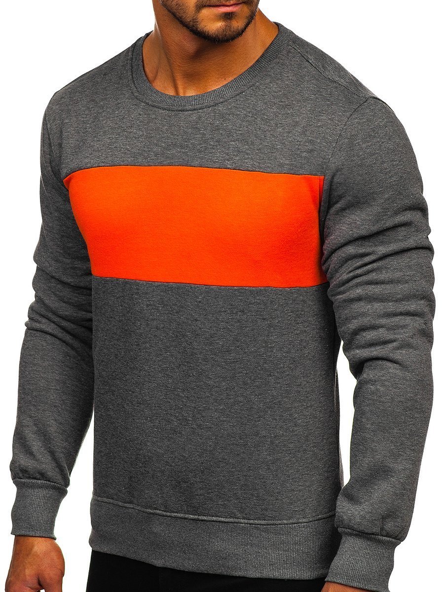Grafit-narancssárga férfi pulcsi - Bolf 2021 - egy népszerű kapucni nélküli modell. Belebújós, a mellkason kontrasztos csík formájában megvalósított divatos berakással. A hátsó rész minta nélkül, az ujjakon és a pulcsi alján széles szűkítővel ellátva. Kerek dekoltázzsál vékony ferdepánttal. A pulcsit azoknak a férfiaknak ajánljuk, akik értékelik a kényelmet és a jó kinézetet. Kellemes tapintású melegítőanyagból készült, ennek köszönhetően jól fekszik és tökéletesen igazodik a férfi alakhoz. Pulcsi divatos berakással, ideálisan néz ki casual és streetes stilizációkban. Nagyszerűen mutat farmerral, katonai nadrággal vagy joggerrel.