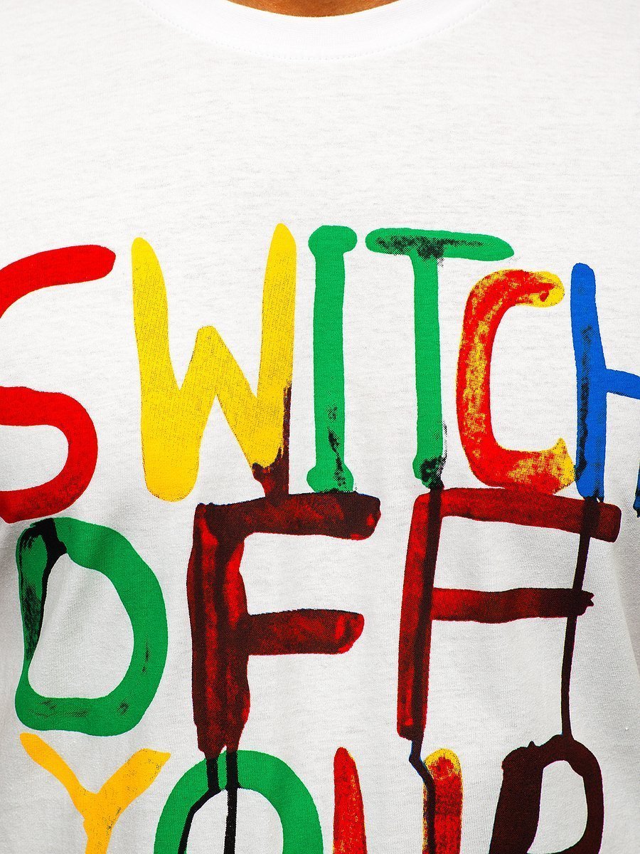 Fehér férfi mintás póló Bolf 1181, nagy, színes nyomattal az elején. Festéket imitáló felirattal. Klasszikus a szabása, kerek dekoltázzsal, mely szegéllyel végződik. A póló hátsó része sima.
