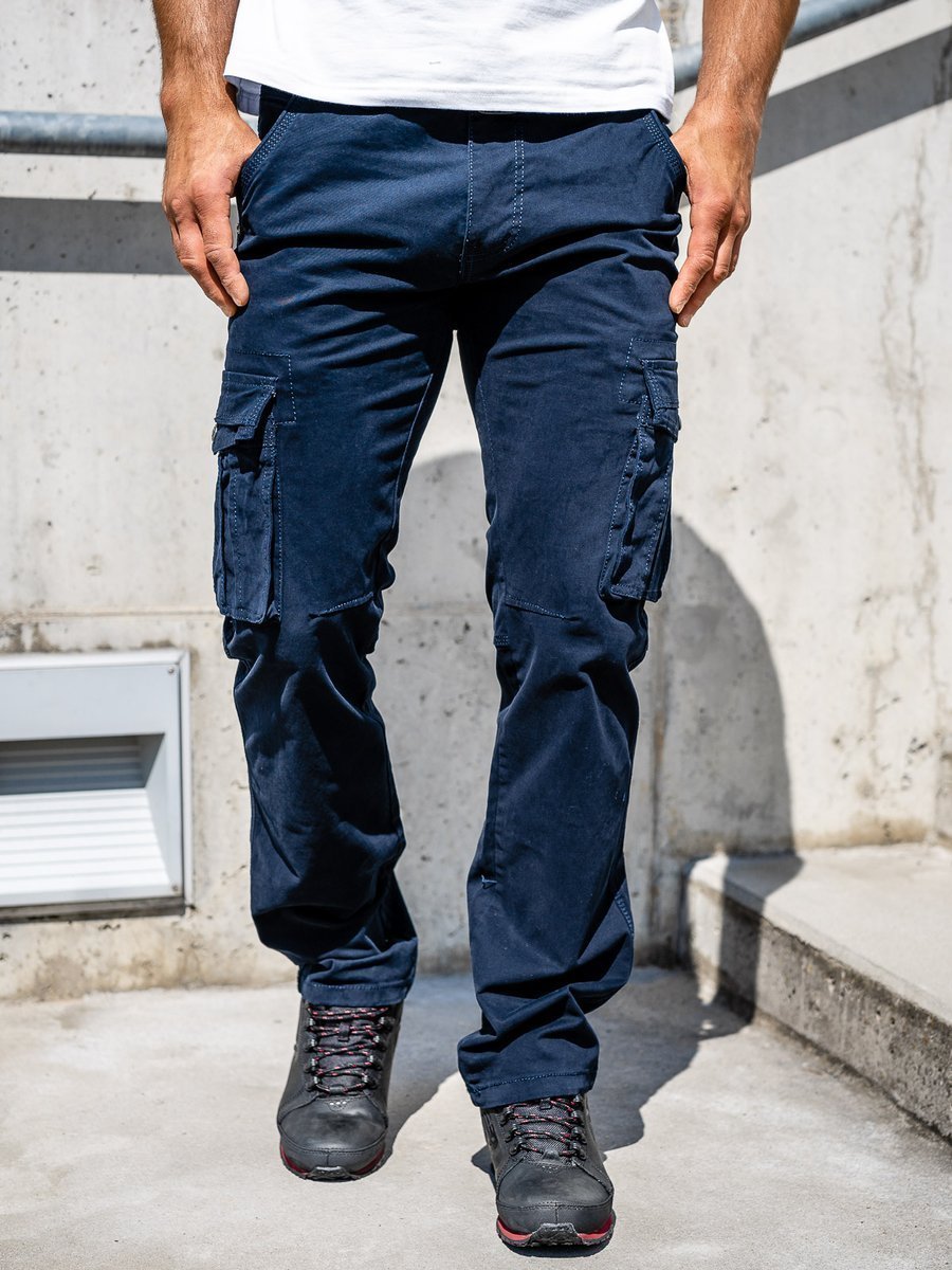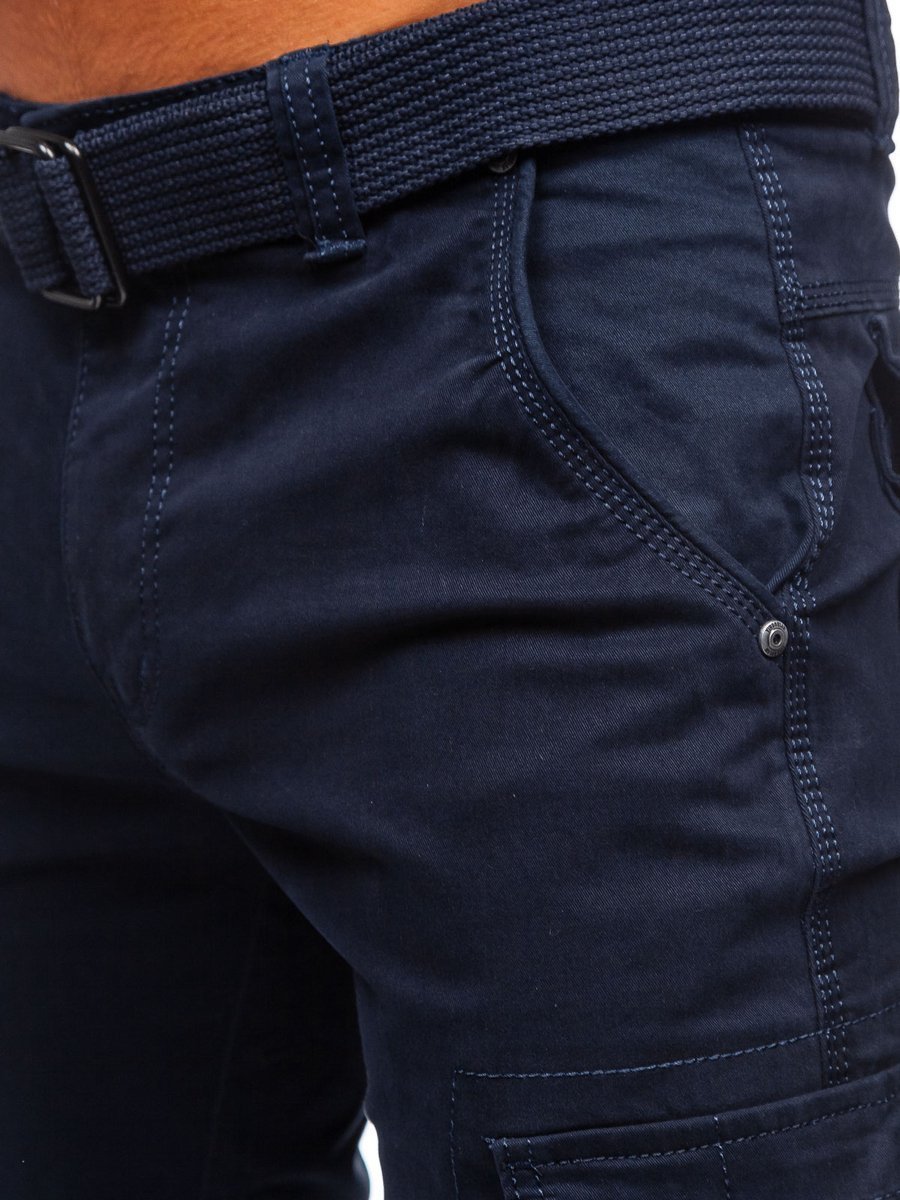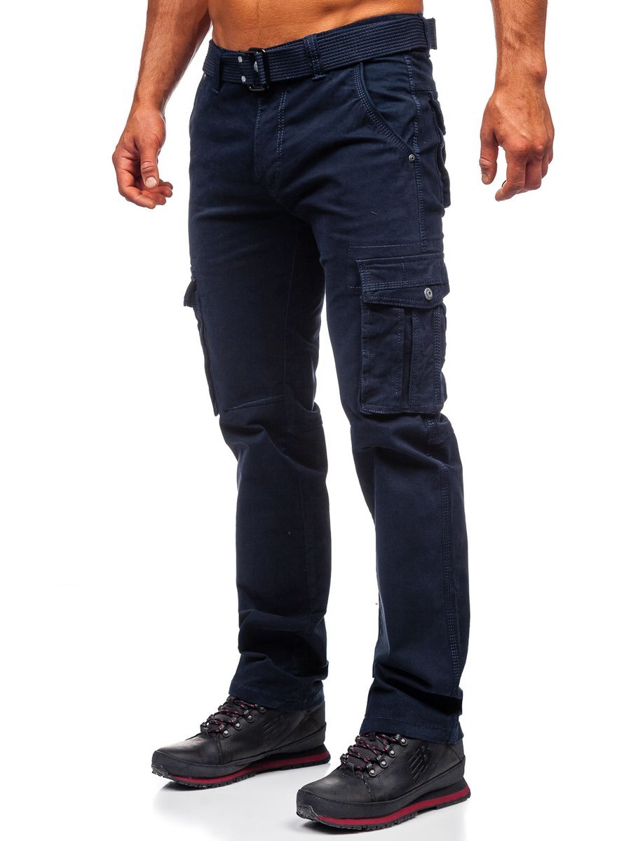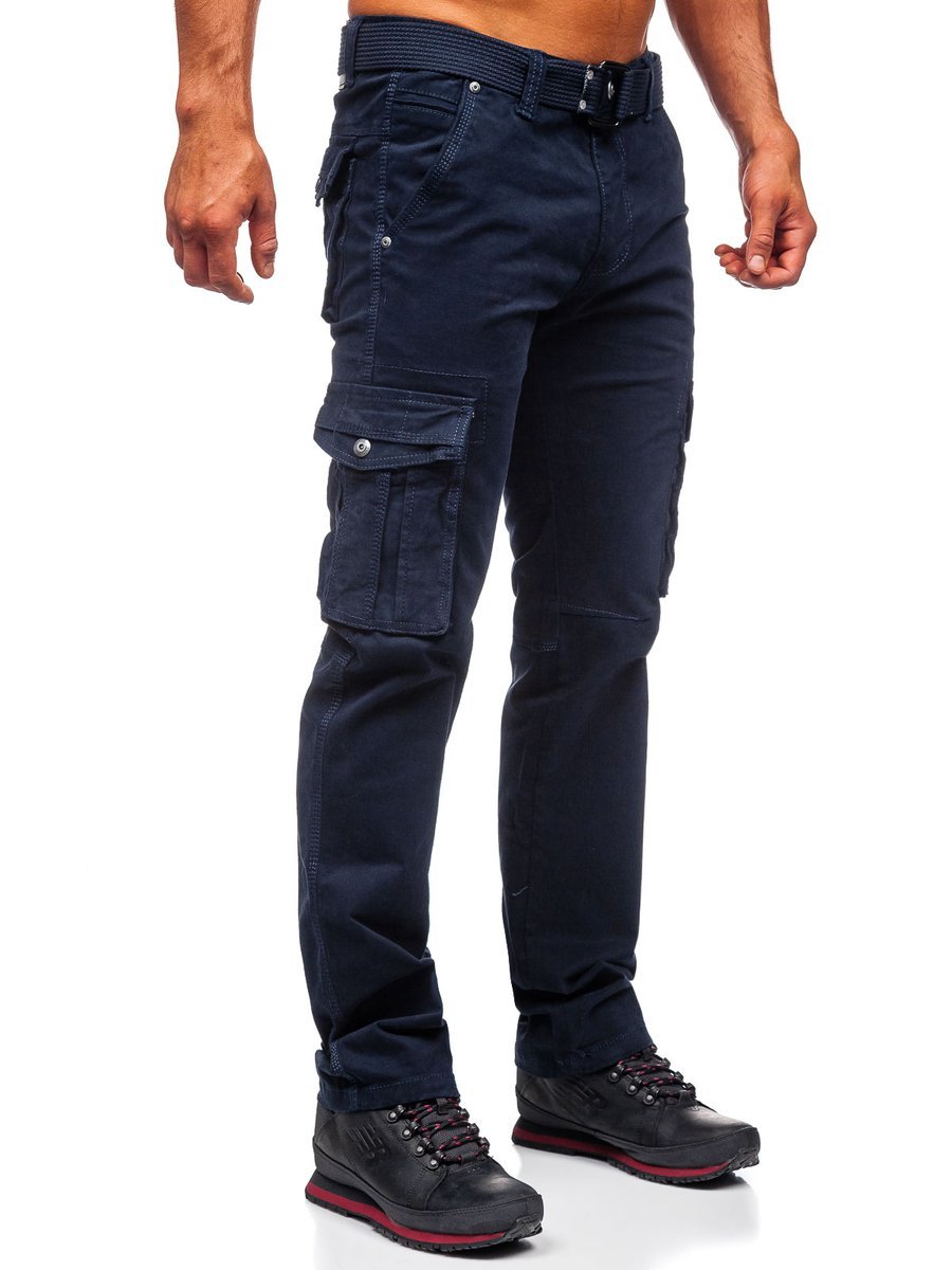 Gránátkék, férfi katonai nadrág övvel - Bolf 1672 - visszafogott színben kapható, különféle színekkel és mintákkal kombinálható. Cipzárral és gombbal zárható katonai nadrág, a szettben megtalálható még egy divatos öv is. Két zsebbel elöl és két-két tépőzáras zsebbel a száron és hátul. Hosszú, egyenes szárral.