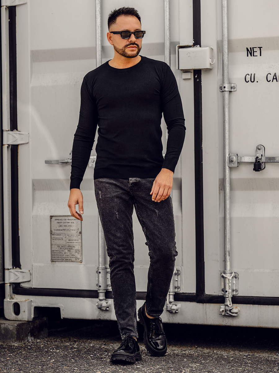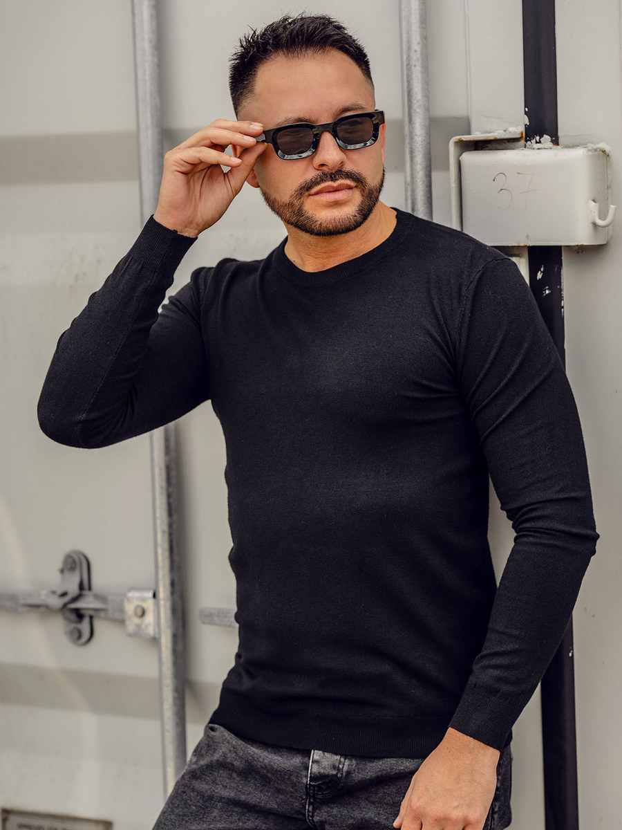 Fekete színű férfi pulóver -Bolf YY01- egyszerű, klasszikus szabású termék. Klasszikus, kerek dekoltázzsal rendelkezik. Az alsó rész és az ujjak szűkítővel vannak ellátva, ennek köszönhetően a pulóver tökéletesen idomul az alakhoz, mindemellett meglepően kényelmes. Ez a modell kilenc színben kapható, ennek köszönhetően mindenki talál valamit magának. A többféle színnek köszönhetően a pulóver könnyen párosítható világosabb színű, vagy akár sötét színű ruhákkal is.Viseld munkába, iskolába, sétára, vagy baráti találkozásra – tökéletes minden alkalomra. Klasszikus pulóver, nagyszerűen mutat chinóval és bőrdzsekivel, ideális stilizációt biztosít a baráti találkozásra. Jól párosítható joggerrel és bomber dzsekivel, egyúttal létrehozva a laza stilizációt egy esti sétára.