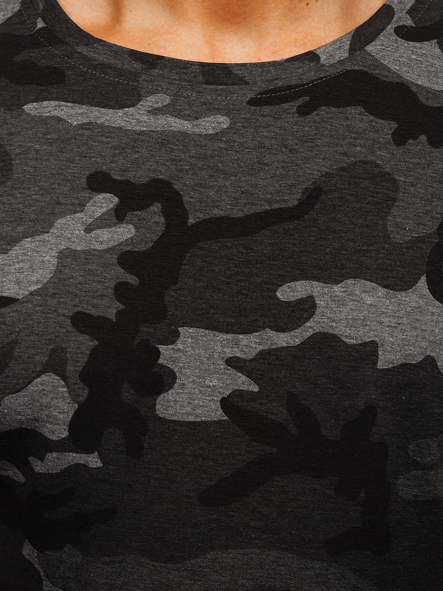 Terepmintás, férfi póló nyomattal grafit színben -Bolf S808- nagyszerű választás azoknak a férfiaknak, akik értékelik a bátorságot és az eredetiséget a hétköznapi stilizációkban. Divatos terepmintával, praktikus kerek dekoltázzsal rendelkezik. A póló ombre stílusú motívumokkal van ellátva. 65%-ban pamutból és 35%-ban poliészterből készült, ennek köszönhetően a póló rugalmas és testhezálló. Az ujjait és az alját egy varrat díszíti, amely jól harmonizál a póló színeivel.