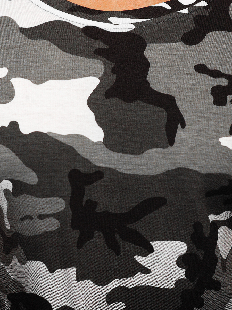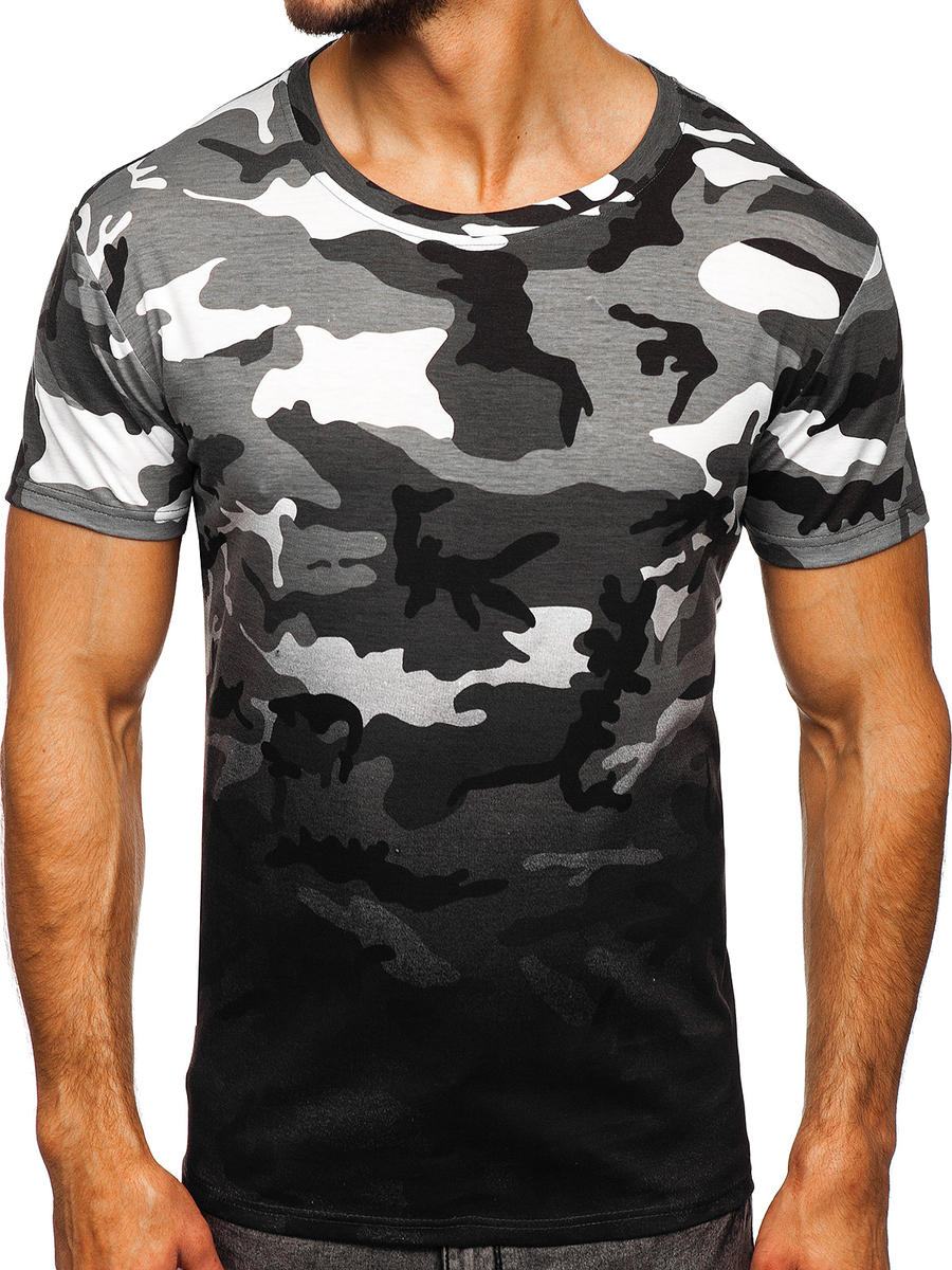 Terepmintás, férfi póló nyomattal szürke színben -Bolf S808- nagyszerű választás azoknak a férfiaknak, akik értékelik a bátorságot és az eredetiséget a hétköznapi stilizációkban. Divatos terepmintával, praktikus kerek dekoltázzsal rendelkezik. A póló ombre stílusú motívumokkal van ellátva. 65%-ban pamutból és 35%-ban poliészterből készült, ennek köszönhetően a póló rugalmas és testhezálló. Az ujjait és az alját egy varrat díszíti, amely jól harmonizál a póló színeivel.