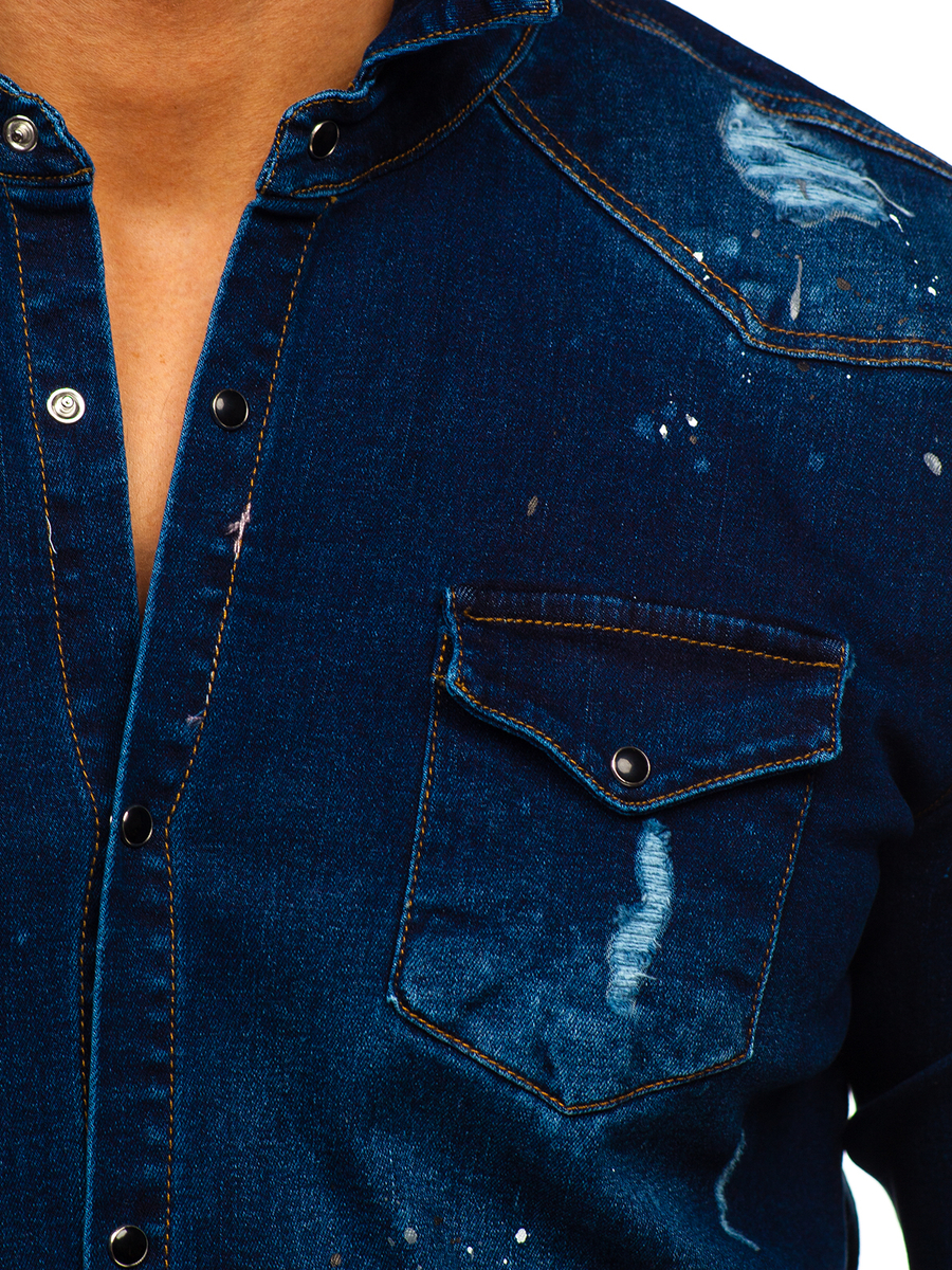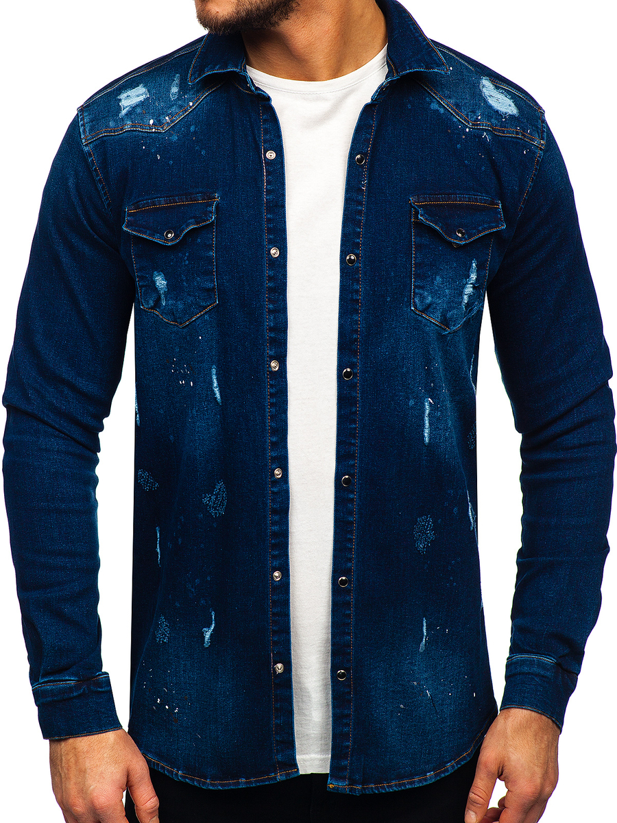 Gránátkék színű, hosszú ujjú, férfi farmering -Bolf R801- tökéletes választás modern, trendkövető férfiak számára. Klasszikus, gránátkék színű ing, egy must have minden férfi szekrényében. Nagyszerűen kiegészíti az outfitedet. Hosszú ujjú ing, mely jól passzol különféle stilizációkhoz. Patentos termék, ennek köszönhetően könnyen fel- és levehető. "Hai" típusú gallérral rendelkezik, mely nagyon népszerű a déli országokban Két praktikus, patentos zsebbel a mellkason. Az ing alja kerekített. Hosszabbítja az alakot. Slim fit fazonú ing. Ennek köszönhetően az alakhoz idomul, kiemeli az alakot. Az inget kívül vagy a nadrágba betűrve egyaránt viselheted. Divatos koptatásokkal a zsebeken, a mellkason és a vállakon.