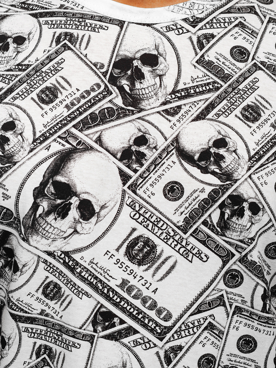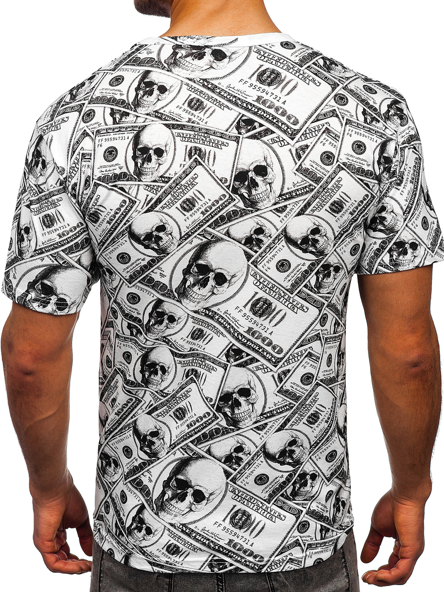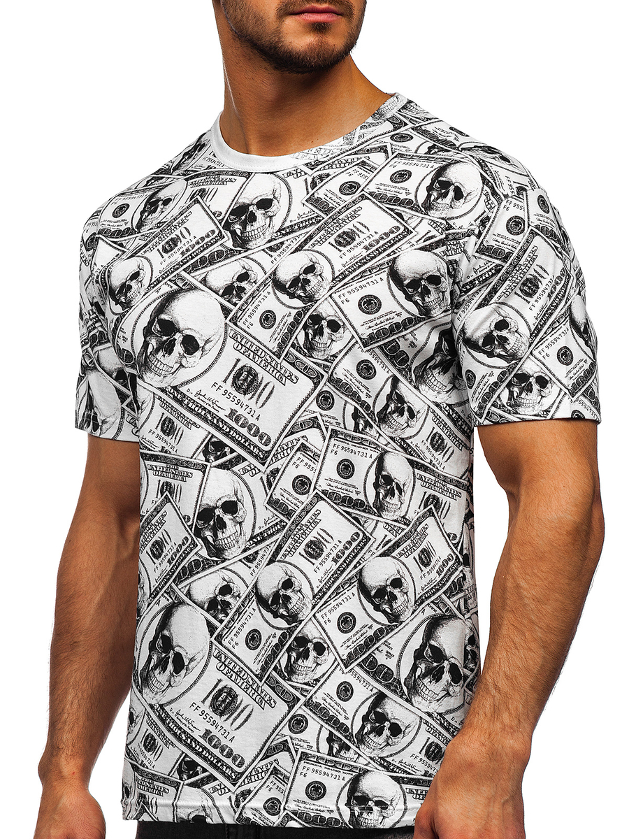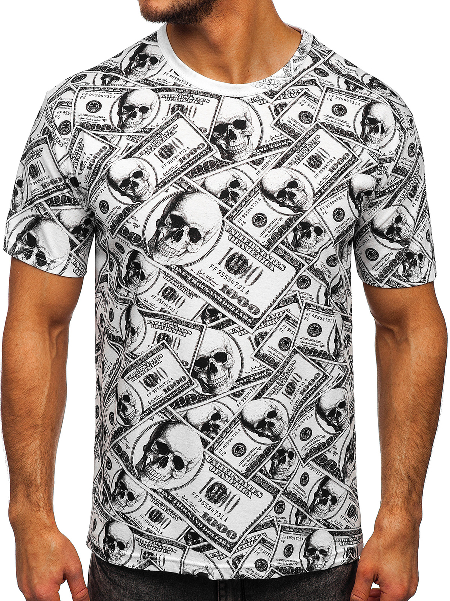 Mintás, férfi póló fehér színben, Bolf 14907, nagyszerűen mutat séta közben, a városi kiruccanások során, vagy az ismerősökkel való találkozások alkalmával. A pólón található egyedi nyomat vonzza a tekintetet és különlegessé teszi. Kerek dekoltázzsal, 100 %-ban pamutból készült, ennek köszönhetően kellemes tapintású és rugalmas. Egy póló a hétköznapi outfit kedvelőinek. Nagyszerűen mutat párban farmerral, chinóval vagy joggerrel.