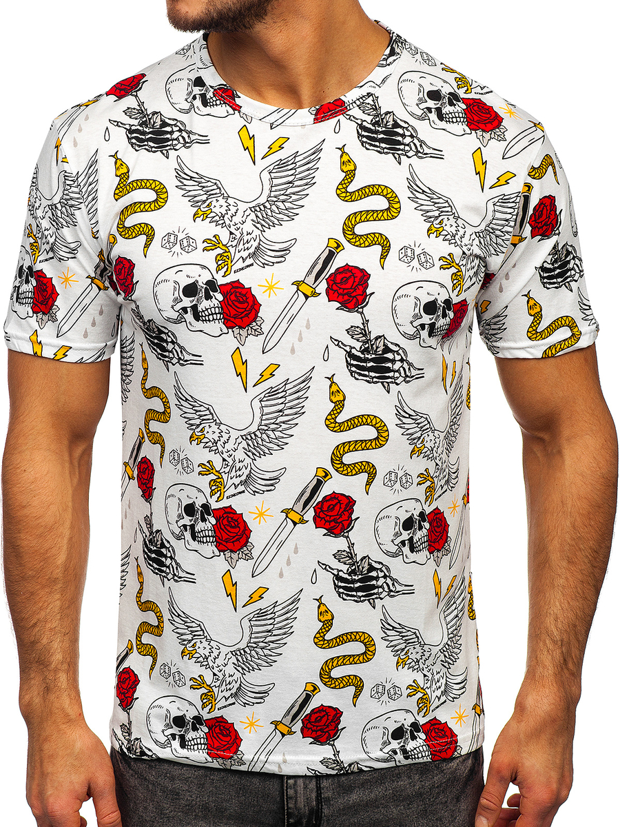 Mintás, férfi póló fehér színben, Bolf 14900, nagyszerű választás a hétköznapi stilizációkhoz. Pamut póló egyedi mintával, minden férfi szekrényében kötelező ruhadarab. Kerek dekoltázzsal rendelkezik. Tökéletes sétára, városi kiruccanásra vagy találkozásra az ismerősökkel. 100%-ban pamutból készült póló. Nagyszerűen alakra szabott, rugalmas és kényelmes. Ideális párosítást alkot farmerral, chinóval és joggerrel.