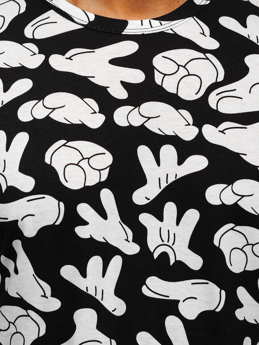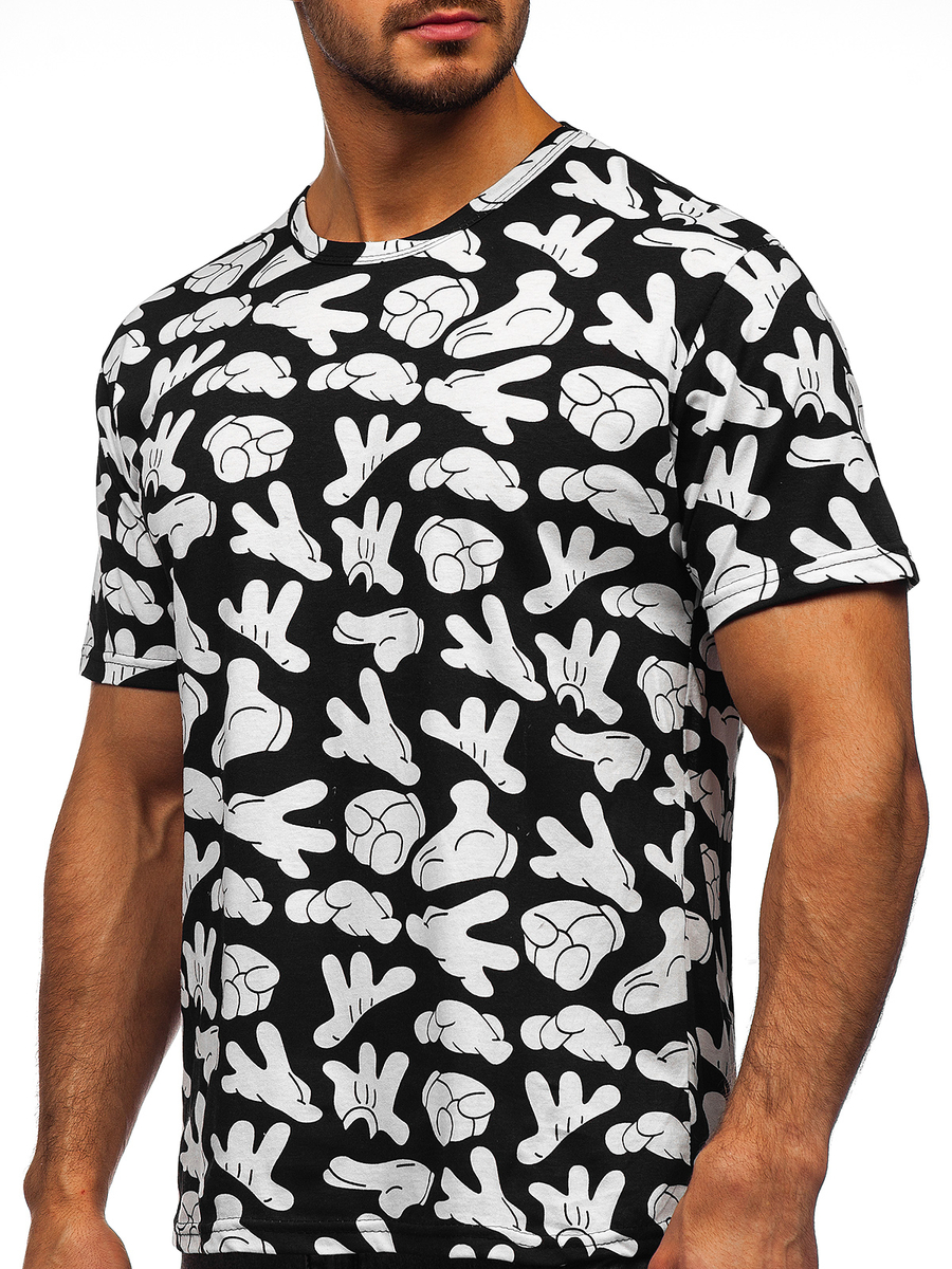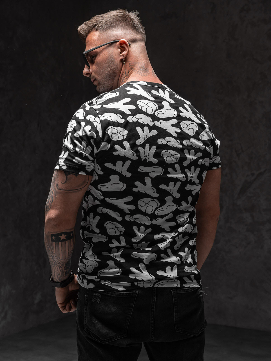 Mintás, férfi póló fekete színben -Bolf 14912- nagyszerű választás azoknak a férfiaknak, akik értékelik az eredetiséget. A stílusos nyomat garantálja, hogy kitűnsz a tömegből. A kerek nyakkivágásnak köszönhetően a póló kényelmesen áthúzható a fejen. Ezt a pólót minden városi stílust kedvelőnek ajánljuk. 100 %-ban pamutból készült, jól illeszkedik a testhez, rugalmas, kellemes tapintású anyagból. Nagyszerű párosítást alkot farmerral és joggerrel.