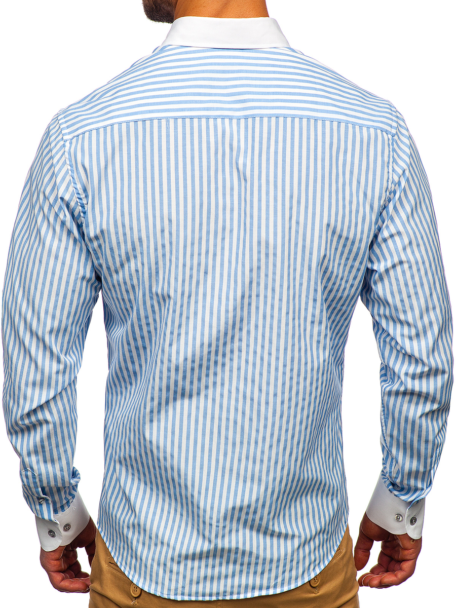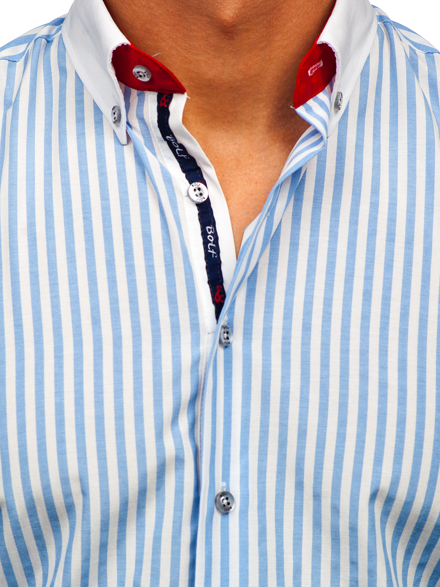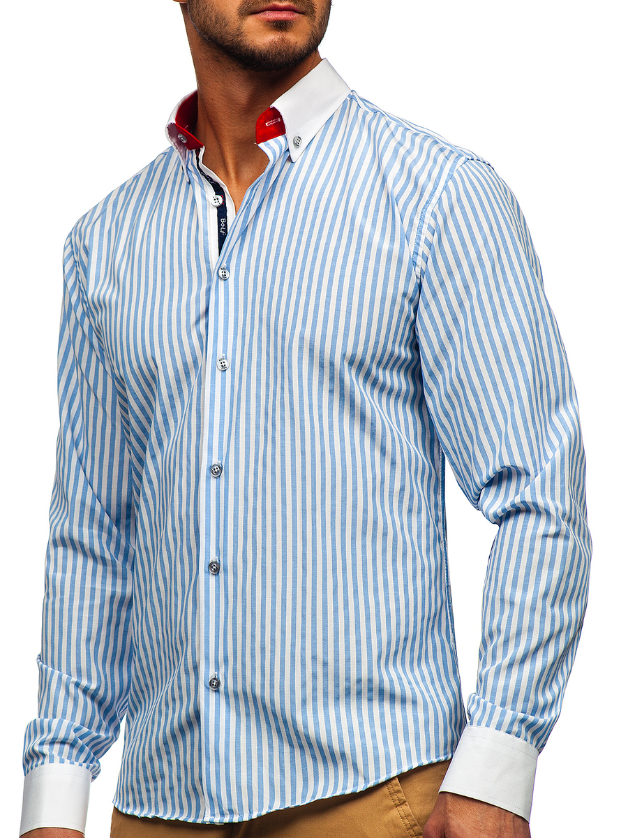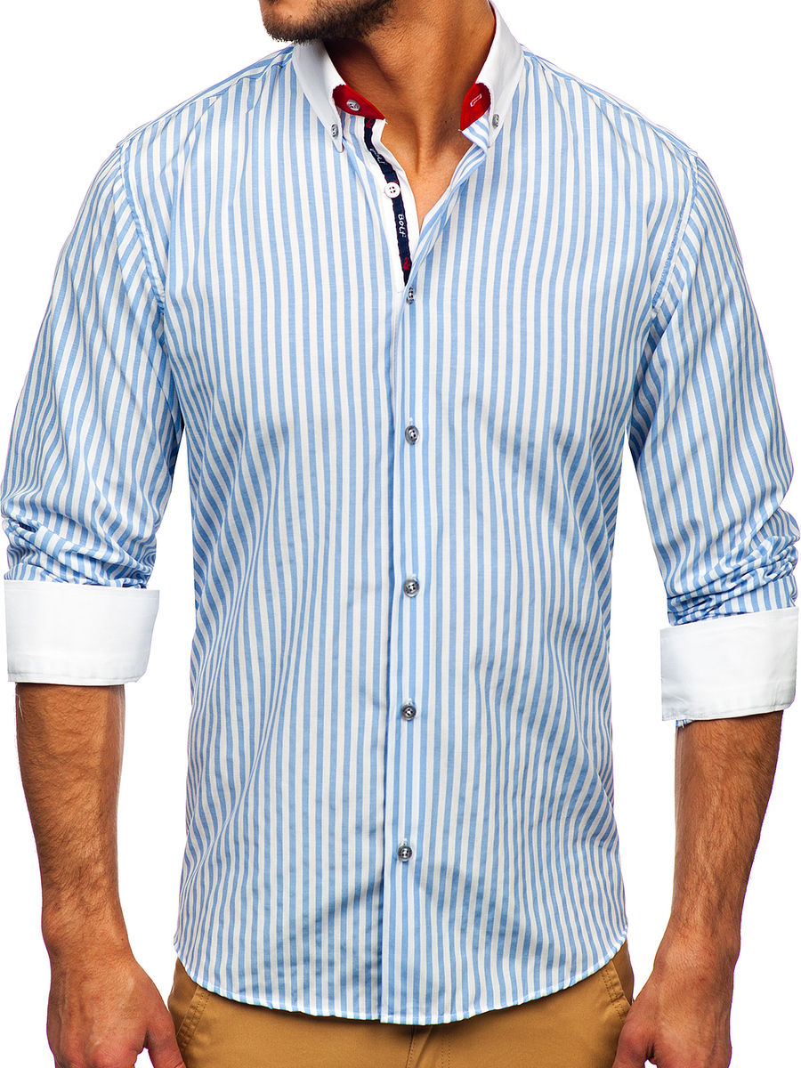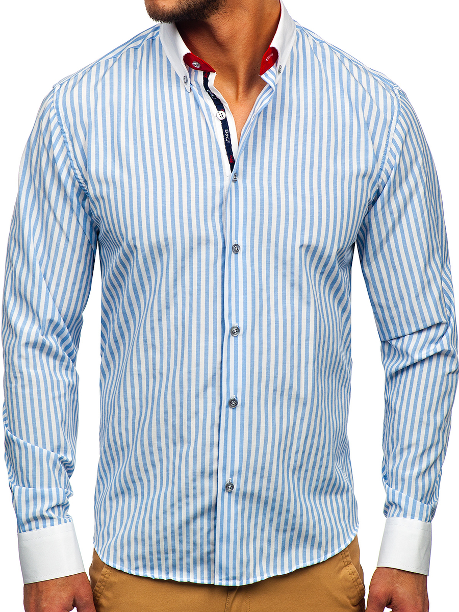 Csíkos, hosszú ujjú férfiing égszínkék színben -Bolf 20727- nagyszerű ajánlat azoknak, akik értékelik a klasszikus eleganciát és a kényelmet. Hosszú ujjú slim fit ing, minden férfi ruhásszekrényének kötelező darabja. Nagyon kényelmes gombos zárral rendelkezik. A button down gallér elegánssá varázsol. Egysoros, vágott mandzsetta, mely állítható és gombolható. A kerekített alsó rész optikailag karcsúsít. Ezt a termék minden casual stílust kedvelőnek ajánljuk, ideális különféle alkalmakra. 80% pamutból és 20% poliészterből készült. Remek párosítást biztosít vászonnadrággal vagy chinóval.