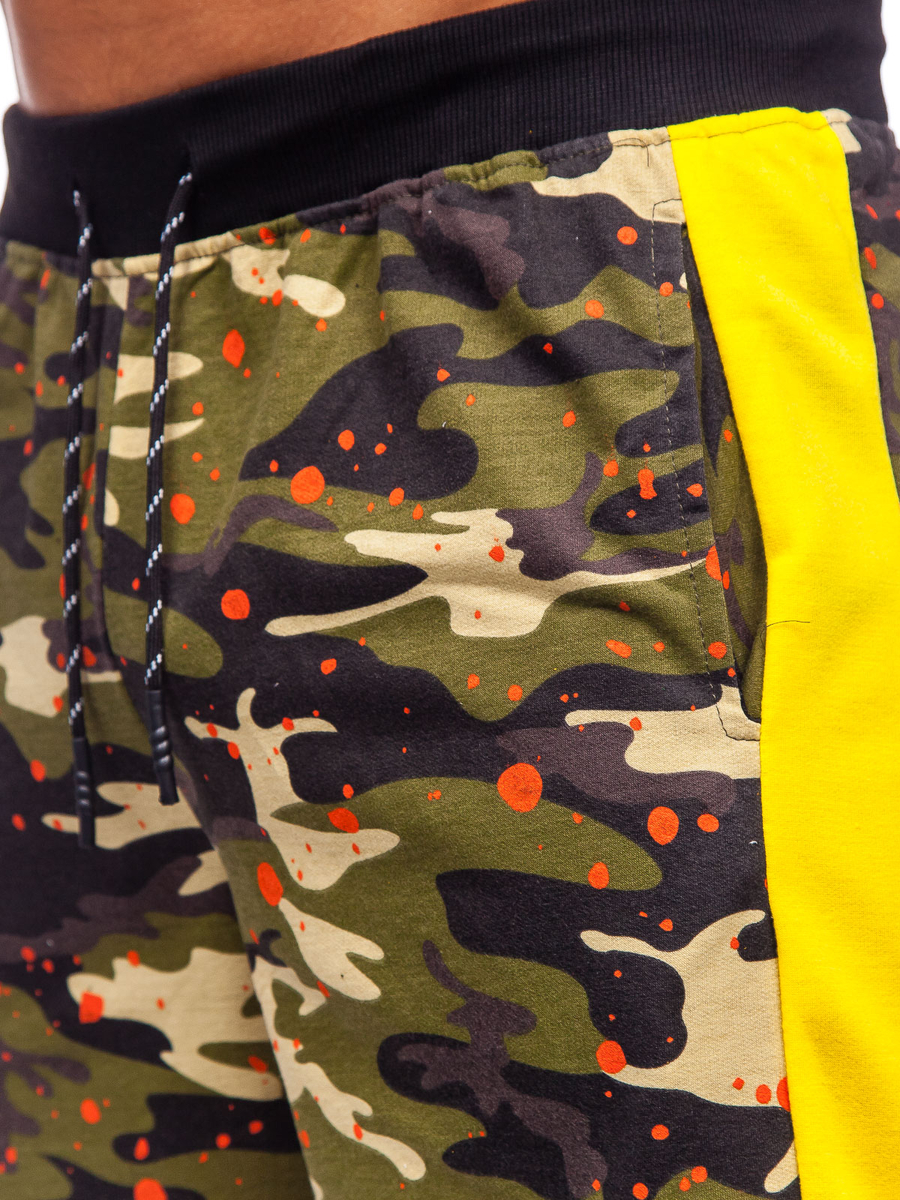 Zöld színű rövid szabadidőnadrág -Bolf KS2579 , nagyszerű választás a nyári hónapokra. Divatos és időtálló terepmintával nyomtatott, mely ugyanúgy megállja a helyét kifinomultabb stílusú öltözetekben, mint világos színű stilizációkban. Állítható derékban erős szűkítővel és megkötővel, nagyszerűen alakra szabott. A termék prakitkus eleme a két zseb oldalt. Rövidnadrág - viselheted edzésen, jogginghoz vagy séta alkalmával. 100%-ban huniészterből készült, ami rugalmassá teszi őket. Perfect matchet biztosít pólóval vagy tank-toppal.