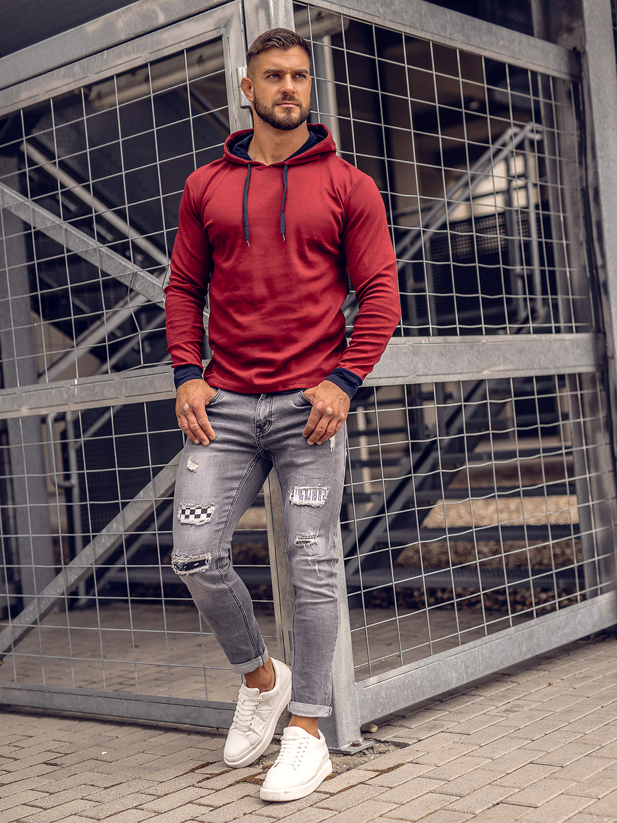 Kapucnis férfi melegítőfelső bordó színben -Bolf 145380- univerzális termék, nagyszerűen mutat nyári és téli stilizációkban egyaránt. Többféle színben kapható, ami széles lehetőségeket kínál a hétköznapi stilizációk létrehozásához. Divatos színű pulcsi a jó outfit alapja. Belebújós, állítható kapucnival, tökéletesen véd a szél és a hideg elől. Az alja és az ujjai kontrasztos szalaggal vannak díszítve. Egy musthave a sportos stílus kedvelőinek. Kényelmet biztosít séta vagy jogging közben, valamint az edzésen is. A melegítőfelső 100%-ban pamutból készült, ennek köszönhetően rendkívül kényelmes és kellemes a tapintása. Farmerral vagy joggerrel érdekes stilizációt alkot. A hűvösebb estéken nagyszerűen mutat bomberdzsekivel.