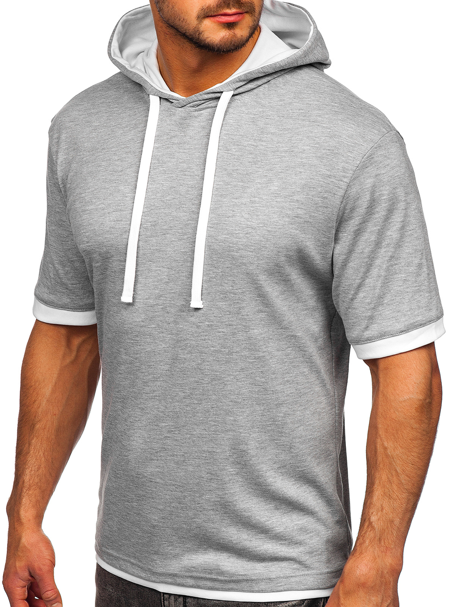 Fantasztikus, szürke színű férfi Bolf póló kapucnival. Nagyszerűen mutat meleg napokon, derékban és az ujjakon kontrasztos szalaggal. Szürke póló minta nélkül jól helyettesíti a klasszikus pólót, vagy a galléros pólót. Viseld farmerral, tréningnadrághoz, vagy rövidnadrággal.