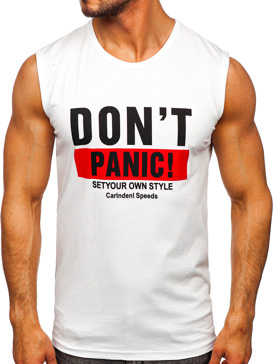 A fehér színű, mintás tank top -Bolf 14827- nagyszerű választás a divatos és kényelmes nyári ruházatot kereső férfiak számára. Magas minőségű anyagból készült, ennek köszönhetően kellemes viseletet és tartósságot biztosít. Minden bizonnyal több szezon alatt is beválik. A póló nagyszerűen kiemeli az alakot, az elején található dizájnos nyomat divatos jelleget biztosít. Beválik a hétköznapi, casual és a sportos stilizációkban is. Viseld joggerrel vagy rövidnadrággal.
