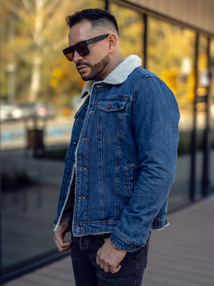 A felhasználók véleménye Bélelt trucker típusú férfi farmerdzseki szőrmés gallérral gránátkék színben Bolf 1156