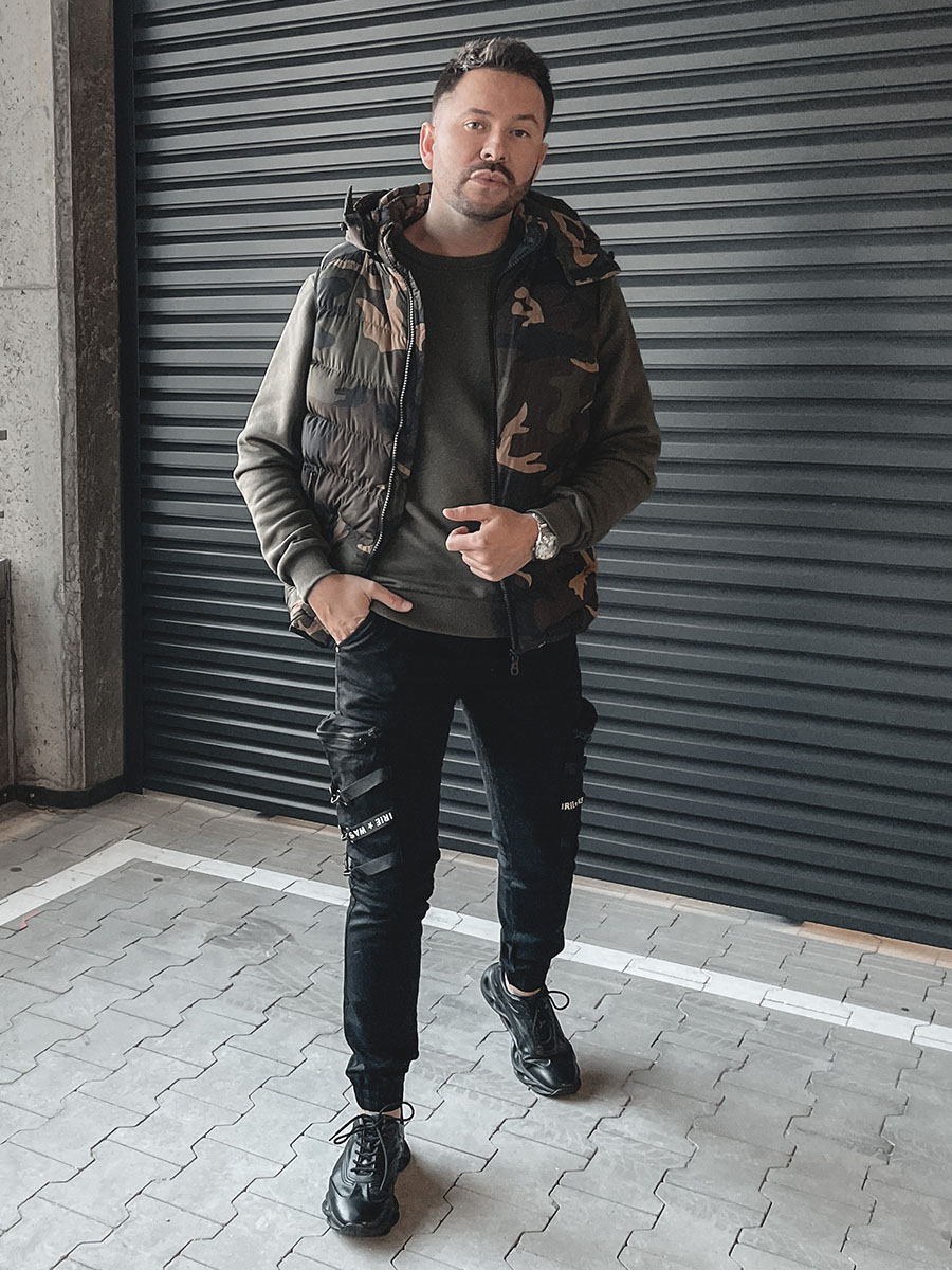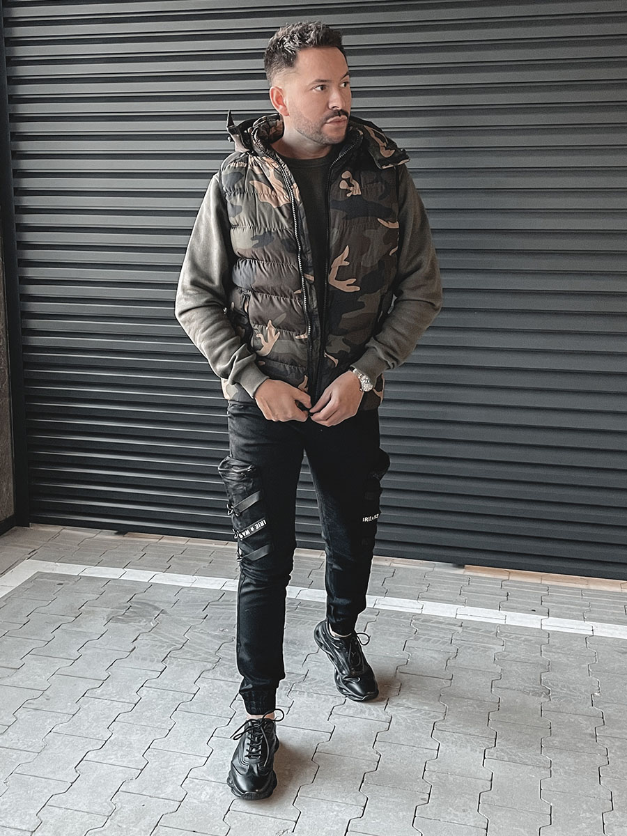 Khaki színű, steppelt, terepmintás férfi mellény kapucnival, Bolf 6876, a sportos és az utcai stilizációkban is megállja a helyét. Steppeléssel a teljes felületen, mely sportos jellemet biztosít. Cipzározható, álló típusú gallérral. Levehető kapucnival rendelkezik. Praktikus jelleget a két cipzározható külsőzseb biztosít.100% póliészterből készült, az alsó része rugalmas szalaggal van ellátva .Ez a klasszikus szabású mellény nagyszerű alternatíva lehet a dzseki helyett az őszi szezonban. Sikeresen helyettesítheti az átmeneti dzsekit vagy akár a pulcsit, védelmet nyújtva a hideg és a szél ellen. Ez a modell időtálló terepmintával tűnik ki, amely jellegzetessé tesz minden stilizációt. A mellény alapként szolgál különböző divatos stilizációkhoz. Fantasztikusan mutat párbanmelegítő szettel mely sportos, lezser kinézetet biztosít. Kiválóan passzol farmerhez és joggerhez.
