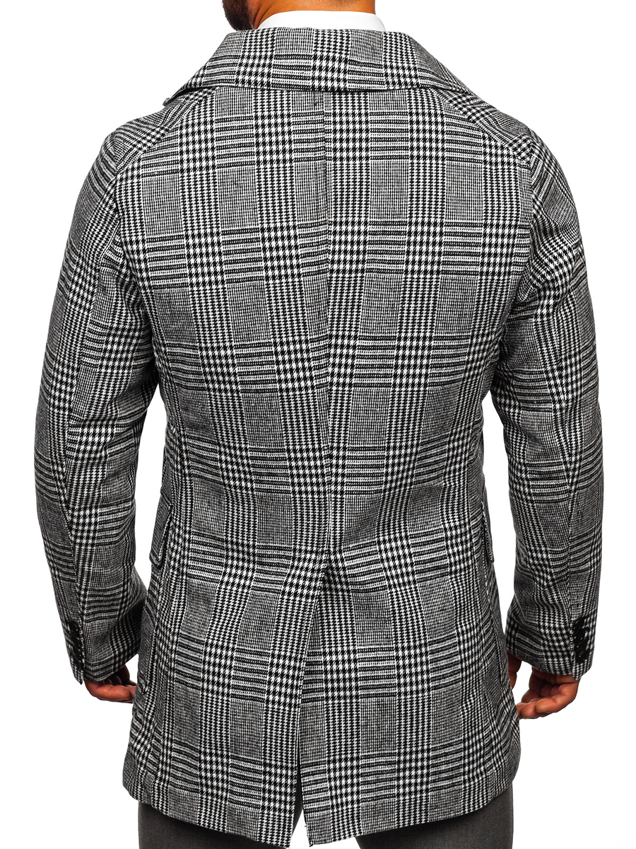 Szürke színű, bélelt, kockás téli férfi kabát, Bolf 1192, minden elegáns és divatos férfi ruhásszekrényének kötelező darabja. Klasszikus, bélelt kétsoros, cipzározható kabát. A nagy, stílusos revers típusú gallér jellegzetessé teszi. Két külső, patentos zsebbel és egy belső, gombolható zsebbel rendelkezik, amelyekben a legfontosabb és a legértékesebb apró tárgyaidat tárolhatod, valamint a pénztárcádat. Dekoratív gombokkal az ujjak végén A kabát magas minőségű anyagból készült. Egyedi, a kockás anyagnak köszönhetően időtálló és elegáns egyben. Nagyszerűen mutat chinóval, inggel és zakóval. Jól párosítható farmerral és garbóval, egyúttal létrehozva a megfelelő stilizációt egy hétköznapi sétára.