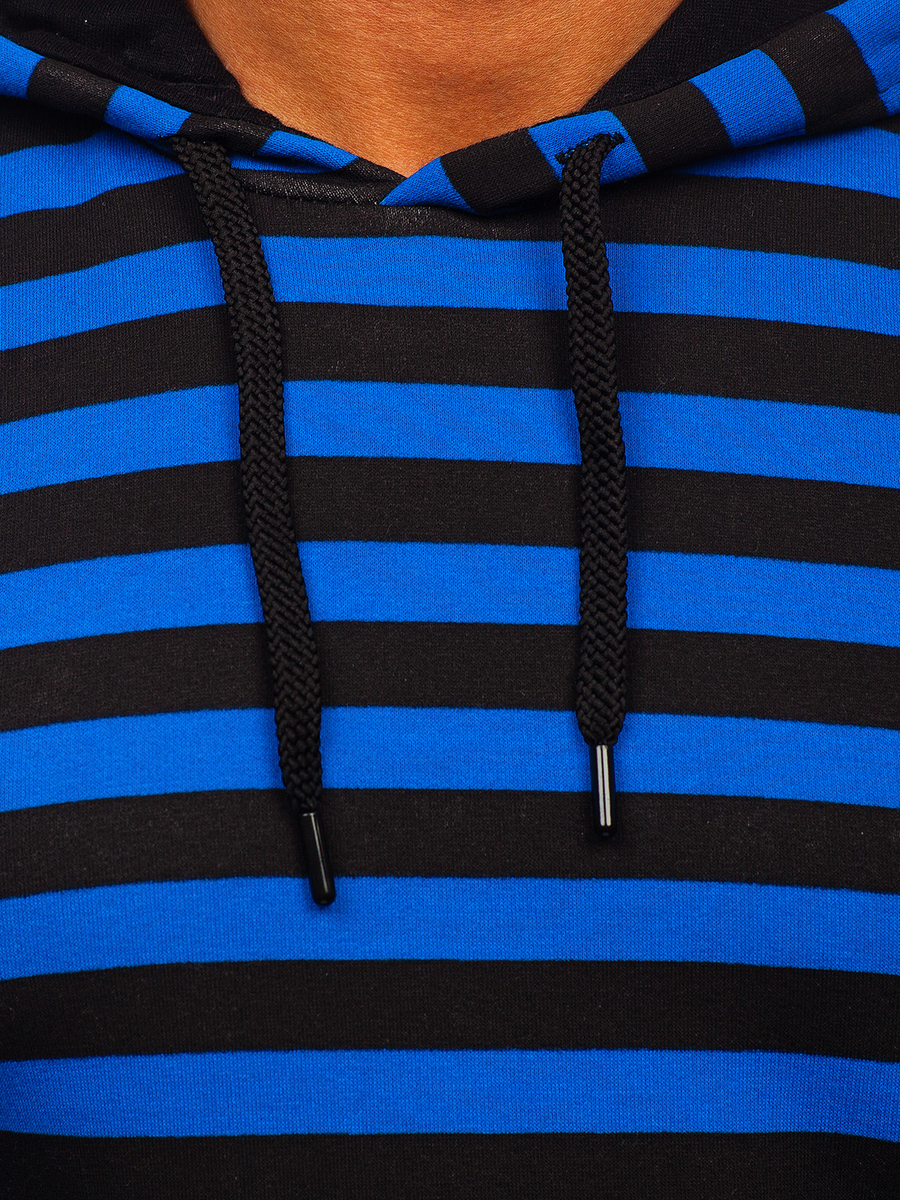 Kék színű, férfi pulcsi nyomattal és kapucnival, Bolf 141029, remek választás lehet a hűvösebb napokra. Kétoldalú, állítható kapucnival. Az ujjak és az alsó rész passzéval ellátva, mely véd a hideg ellen. 70%-ban pamutból és 30% poliészterből készült, ennek köszönhetően rendkívül kellemes a tapintása. A termék prakitkus eleme a két oldalsó zseb. Ez a modell dekoratív csíkokkal tűnik ki, három klasszikus színben kapható. Bármely évszakban és szinte bármilyen körülmények között megállja a helyét. Megfelelő sportoláshoz, sétához vagy városi kiruccanáshoz. Egy baráti összejövetelen viselheted farmerral,katonai nadrággal vagy joggerrel. Párosíthatod melegítőnadrággal és átmeneti dzsekivel, sportos kinézetet biztosít.