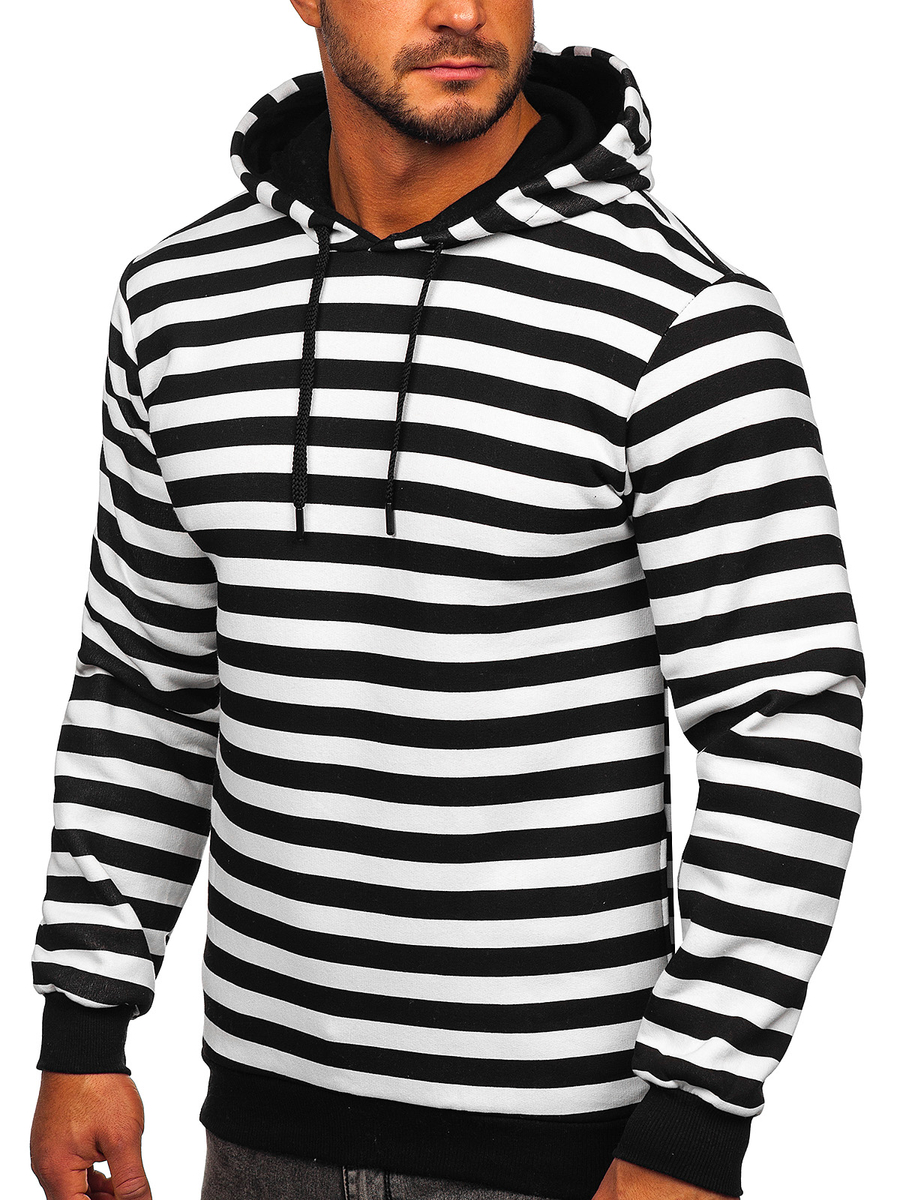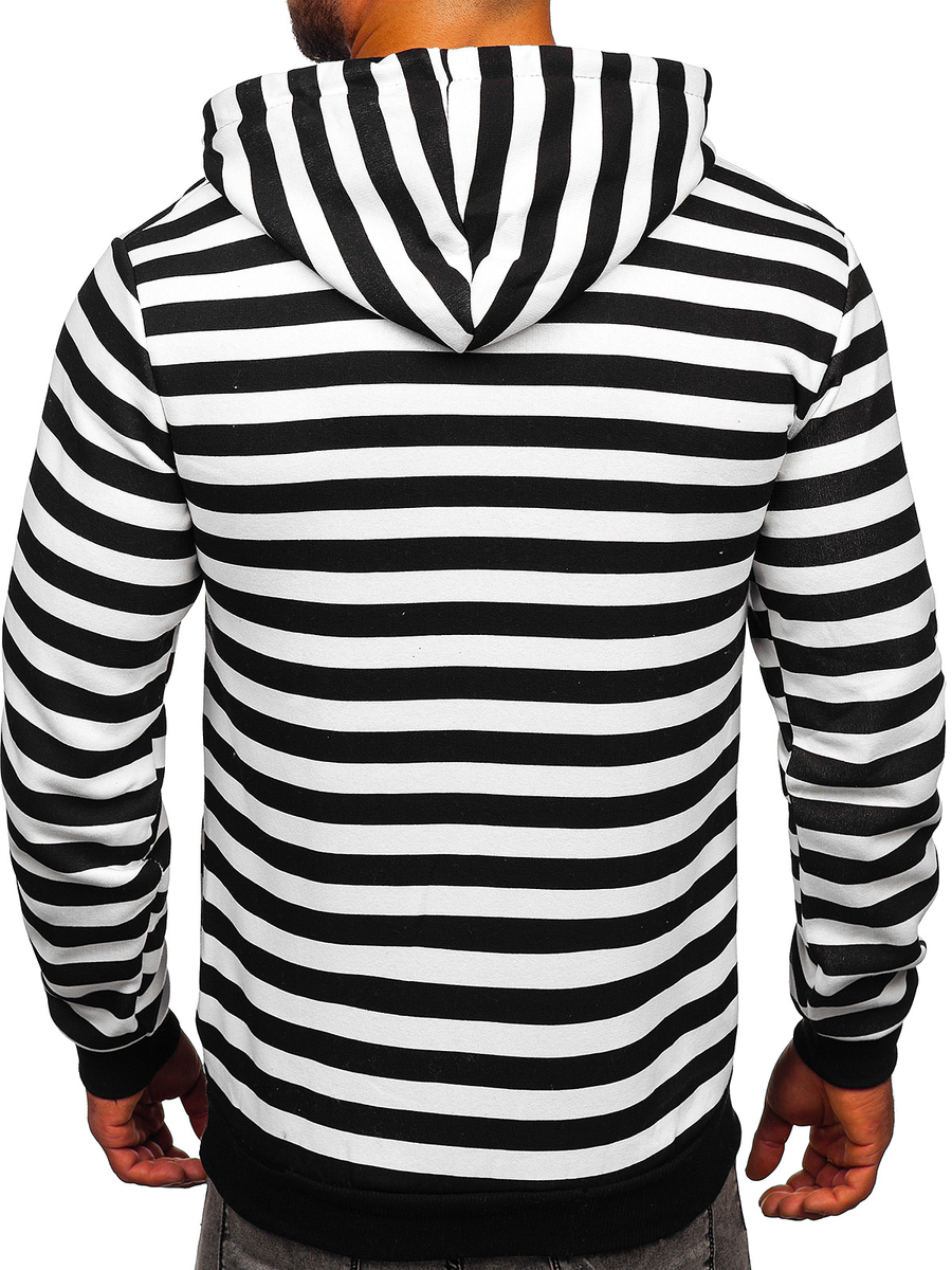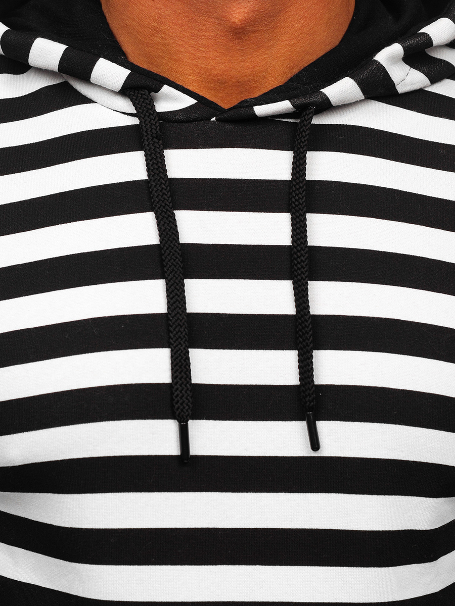 Fehér színű, férfi pulcsi nyomattal és kapucnival, Bolf 141029, remek választás lehet a hűvösebb napokra. Kétoldalú, állítható kapucnival. Az ujjak és az alsó rész passzéval ellátva, mely véd a hideg ellen. 70%-ban pamutból és 30% poliészterből készült, ennek köszönhetően rendkívül kellemes a tapintása. A termék prakitkus eleme a két oldalsó zseb. Ez a modell dekoratív csíkokkal tűnik ki, három klasszikus színben kapható. Bármely évszakban és szinte bármilyen körülmények között megállja a helyét. Megfelelő sportoláshoz, sétához vagy városi kiruccanáshoz. Egy baráti összejövetelen viselheted farmerral,katonai nadrággal vagy joggerrel. Párosíthatod melegítőnadrággal és átmeneti dzsekivel, sportos kinézetet biztosít.