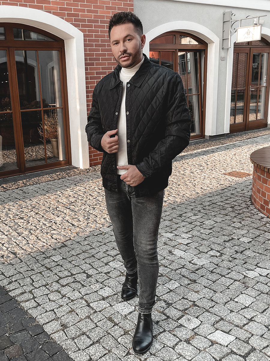 Fekete színű, átmeneti, steppelt férfi dzseki -Bolf M13081-egy őszi és tavaszi klasszikus. Az alsó része passzés, ennek köszönhetően jól idomul az alakhoz és véd a hideg elől. Rombusz alakú steppeléssel a teljes felületen, mely különleges jellemet biztosít. Patentos, két külső zsebbel, amelyek szintén patenttal zárhatók. További eleme még a belső zseb. Az univerzalitásnak köszönhetően nagyszerűen mutat sportos és casual outfitekben. Nagyszerűen mutat hétköznapi stilizációkban, a bevásárlások során vagy reggeli jogging közben. A dzseki fő előnyei a könnyedsége és a kényelmes viselete. Hozz létre egy saját egyedi stilizációt egy dzseki, egy chinó és egy hosszú ujjú felső párosításával.