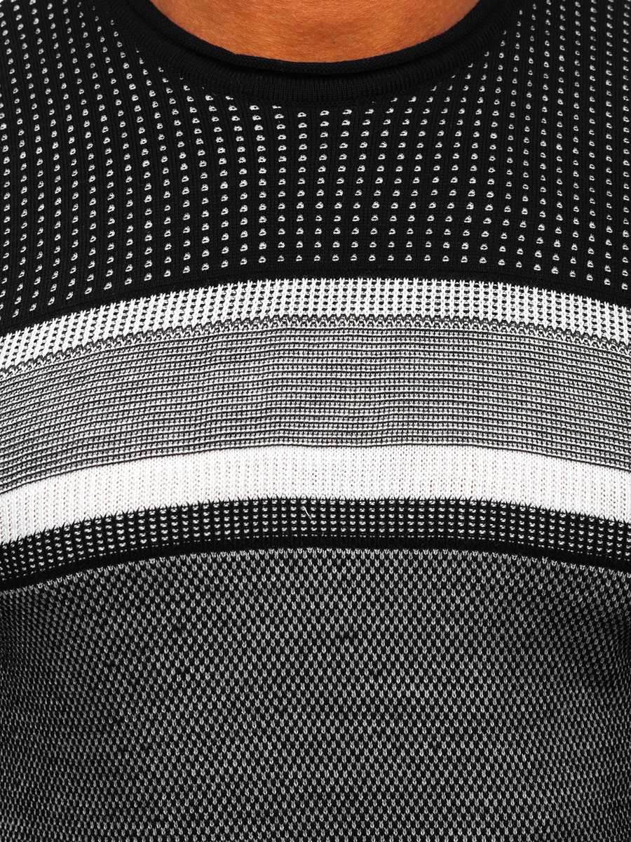Fekete színű férfi pulóver -Bolf 2510- egyenes, klasszikus szabású termék. Az alsó rész és az ujjak szűkítővel vannak ellátva, ennek köszönhetően a pulóver tökéletesen idomul az alakhoz, mindemellett meglepően kényelmes. 50% gyapjúból és 50% akrilból készült. Ez a modell néhány színben kapható, ennek köszönhetően mindenki talál ideálisat magának. A divatos minta különleges karaktert kölcsönöz neki. A kifinomult színnek köszönhetően a pulóver könnyen párosítható világosabb színű, vagy akár sötét színű ruhákkal is.Viseld munkába, iskolába, sétára, vagy baráti találkozásra – tökéletes minden alkalomra. Klasszikus pulóver, nagyszerűen mutat chinóval és bőrdzsekivel, ideális stilizációt biztosít a baráti találkozásra. Jól párosíthatójoggerrel és bomber dzsekivel, egyúttal létrehozva a laza stilizációt egy esti sétára.