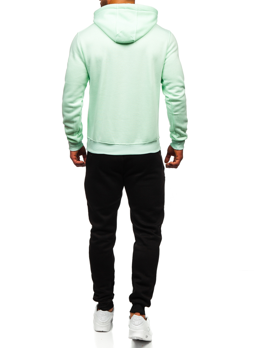 Mentazöld színű, kapucnis férfi melegítő együttes - Bolf D002 - tréning szett, mely a szabadban végzett edzéseken vagy az edzőteremben is megállja a helyét. A szett egy pulcsit és egy nadrágot tartalmaz. A kapucnis pulcsinak időtálló kenguru típusú zsebe van. A nadrág állítható derékban erős megkötővel és szűkítővel és két zsebe van oldalt. Sportos jelleget az egyenes, testhezálló fazon biztosít. Finom, kellemes tapintású anyagból készült termék. A melegítő szett alapként szolgálhat hétköznapi és sportos stilizációk létrehozásában is. A pulcsi és a nadrág jól párosítható különböző ruhadarabokkal, ami széles lehetőségeket kínál a mindennapi stilizációk létrehozásához. A szett nagyszerűen mutat pólóval könnyű átmeneti dzsekivel vagy sportdzsekivel. A melegítő szett különféle helyzetekben is megállja a helyét, akár otthon, séta közben vagy bevásárláskor, valamint az edzőteremben vagy a szabadban végzett edzéseken is beválik.