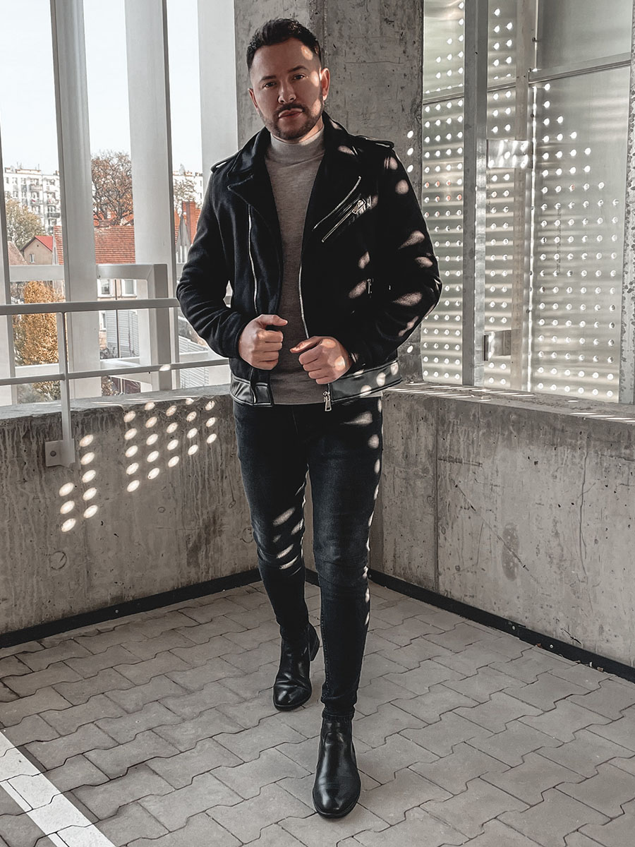 Fekete színű, átmeneti férfi motoros dzseki - 79M15501- klasszikus, egyenes szabású. A termék cipzáros, rewers típusú a gallér. A vállpánt egyedi karaktert kölcsönöz neki. Három külső, cipzározható zsebbel és egy belső, zár nélküli zsebbel rendelkezik. Patentos ujjakkal, egyenes alsó résszel, nagyszerűen passzol az alakhoz. Az alkalmi stílusú dzseki lehetővé teszi számos egyedi stilizáció létrehozását. Ideálisan beválik a hűvösebb napokon is. Baráti összejövetelekre a dzsekit párosíthatod pulcsivalés farmerral. Pulóverrel és joggerrel párosítva ideális stilizációt biztosít a hűvösebb napokon.
