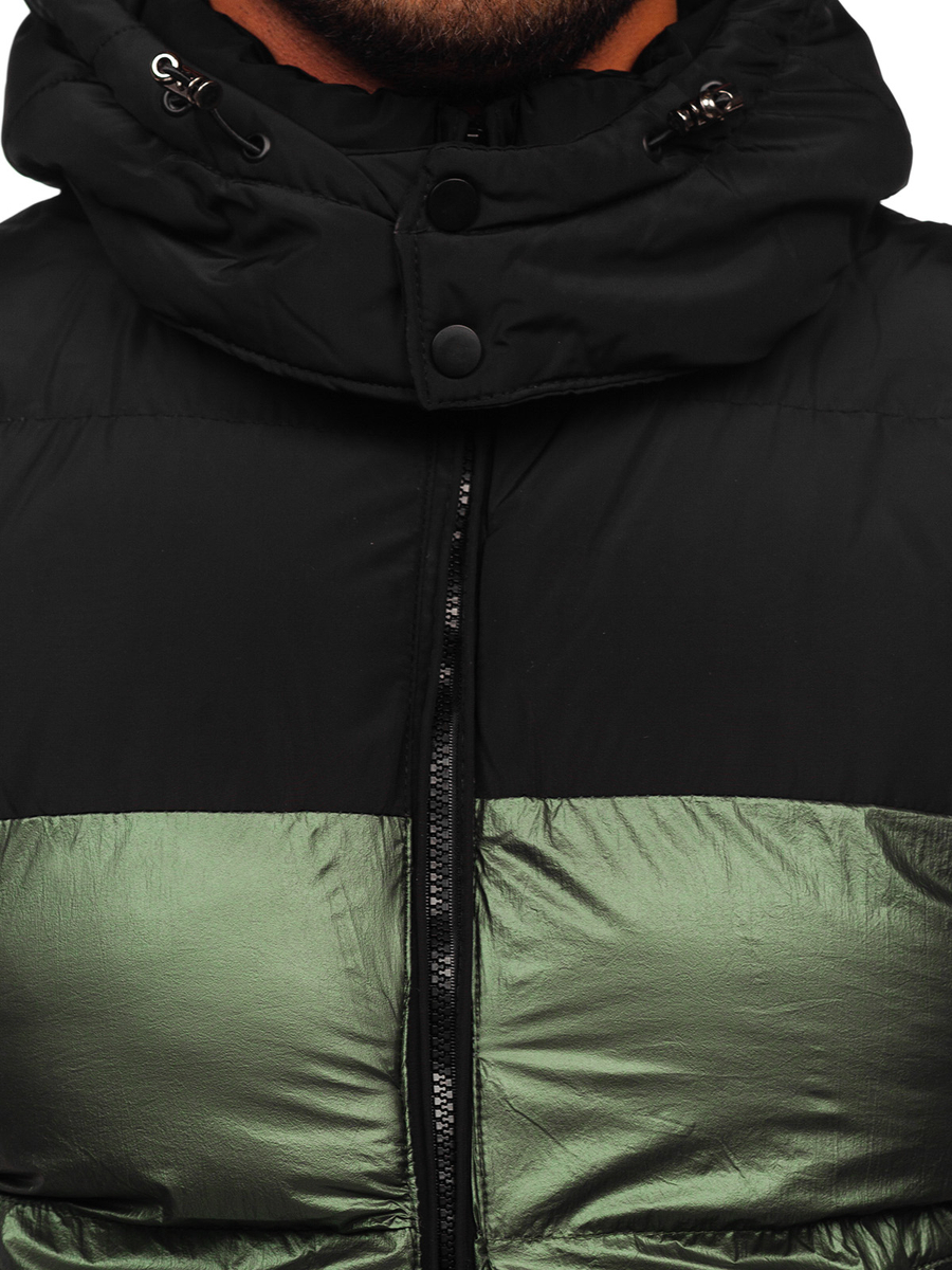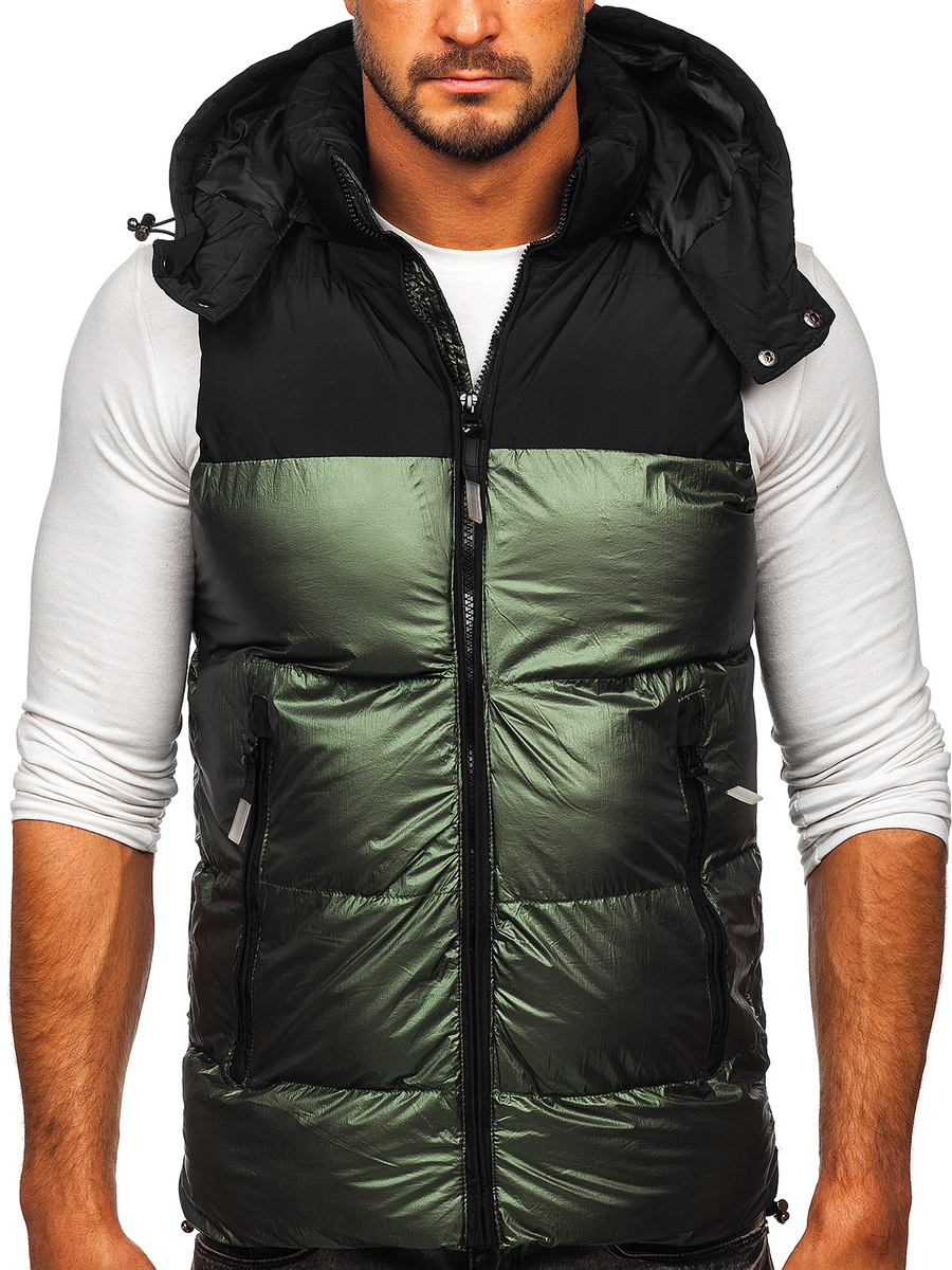 Zöld színű, steppelt férfi mellény kapucnival -Bolf 13079- ideálisan beválik őszi és tavaszi stilizációkban. Cipzározható mellény, levehető kapucnival és állógallérral rendelkezik – ennek köszönhetően nagyon praktikus. Két külső, cipzározható zsebbel és egy belső zsebbel rendelkezik, amelyekben a legfontosabb tárgyaidat tárolhatod, mint például a telefon, a pénztárca vagy a dokumentumok. Néhány féle színben kapható mellény, sportos, egyszerű fazonú. A mellény - tökéletes ajánlat azoknak, akik sportolnak. Tökéletes hétköznapokra, városi kiruccanásra, találkozásra az ismerősökkel vagy esti sétára. Outfites stilizációt alkot hosszú ujjú felsővel és joggerrel. Nagyszerűen mutat párban pulcsival és farmerral.
