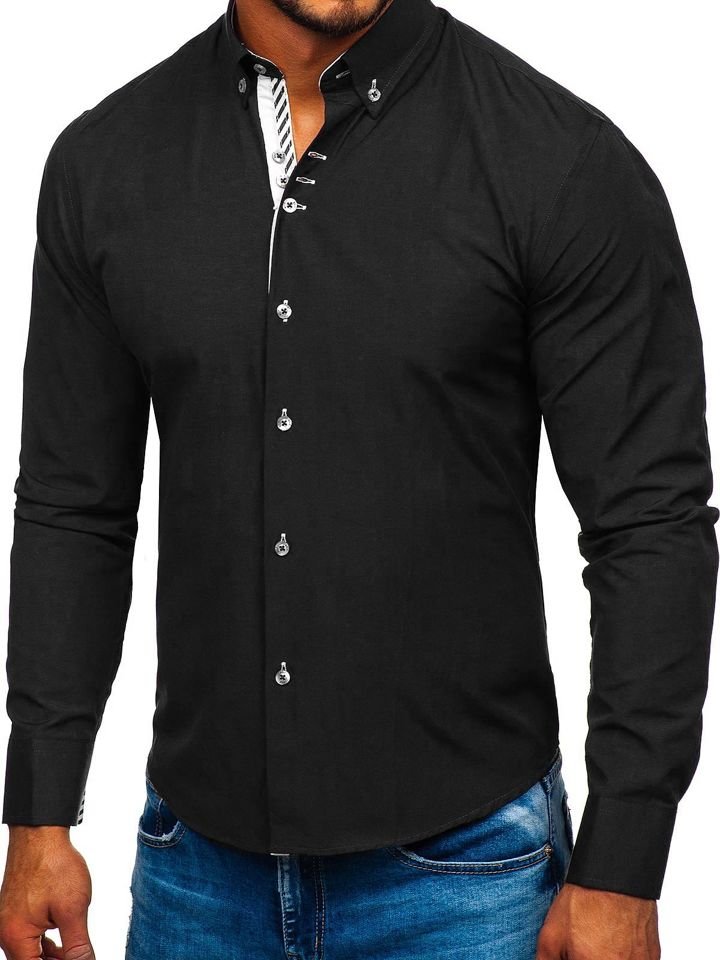 Fekete, elegáns férfiing a Bolfkollekcióból. Könnyű, tökéletesen igazodik a férfi alakhoz. A hosszú ujjú slim fit ing erősen feldobja a lookot farmerral. A fekete ing nagyon elegánsan mutat chinó nadrággal és zakóval.