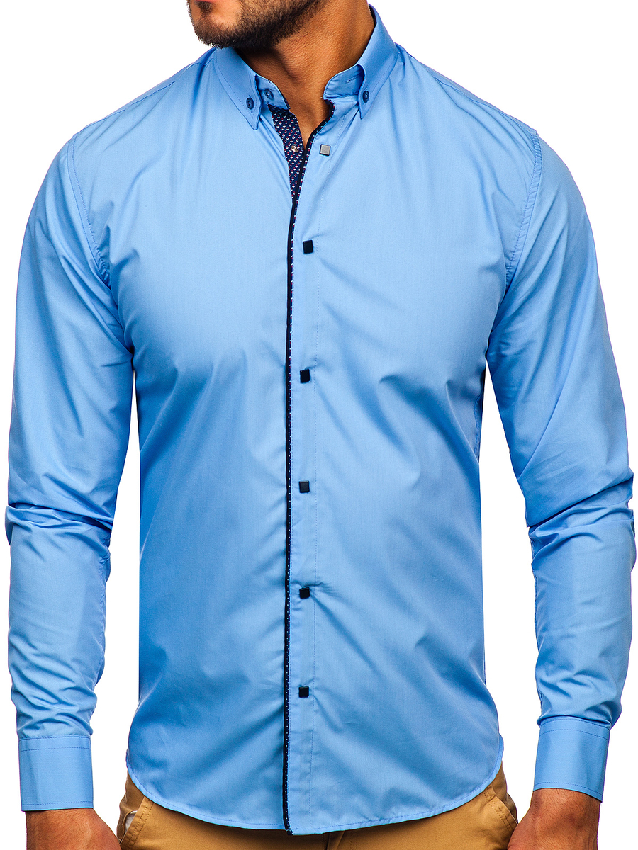 Égszínkék, hosszú ujjú ing, kontrasztos kiegészítőkkel. Divatos, kényelmes, nagyszerű minőség. Világoskék slim fit Bolf férfiing, nagyszerűen mutat farmerral és chino nadrággal. Nagyszerű gallérral és gombokkal. Nagyszerűen mutat hétköznapi, stílusos öltözékekben.