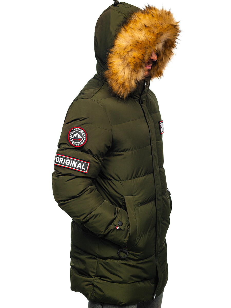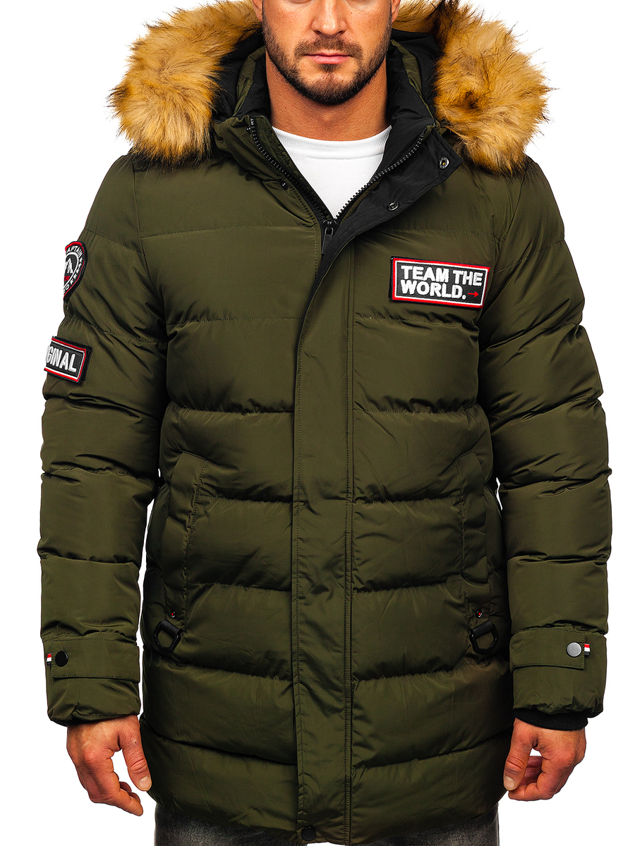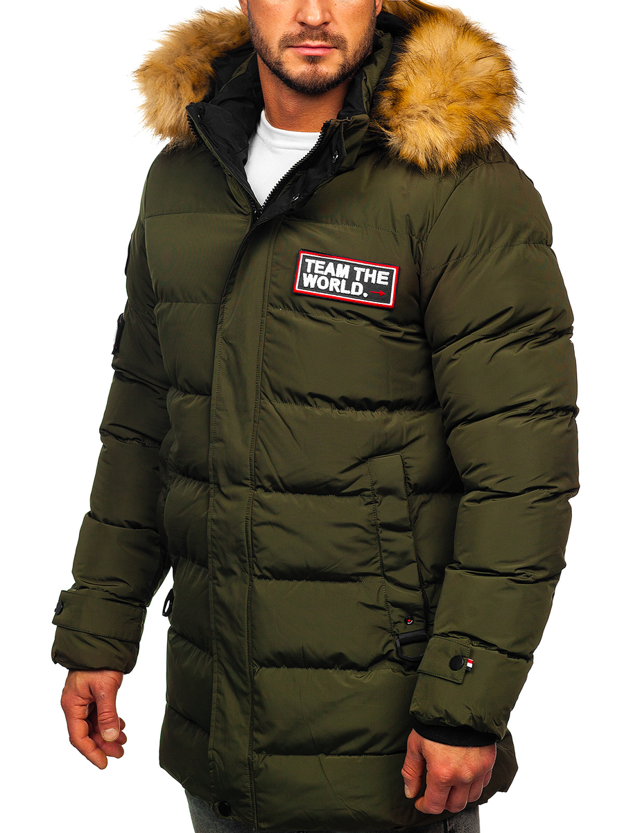 Khaki színű, hosszú, steppelt téli férfi dzseki -Bolf 6476- klasszikus módon, cipzárral és patenttal zárható. Álló típusú gallérral, levehető kapucnival, mely tökéletesen véd a szél és az eső elől. A kapucninál levehető szőrme található. Az idomuló és egyenes szabásának köszönhetően benne mindenki különlegesnek látszik. Karakterét adekoratív nyomatok a mellkason és az ujjon adjákA dzseki két oldalsó, patentos zsebbel és egy belső, gombolható zsebbel rendelkezik. Tépőzárral állítható ujjakkal,belülről passzéval van ellátva,ennek köszönhetően jól idomul az alakhoz és véd a hideg elől.Megfelelő sétára, baráti találkozásra vagy városi kiruccanásra. Ez a dzseki tökéletes párosítást alkot farmerralés klasszikus pulóverrel.