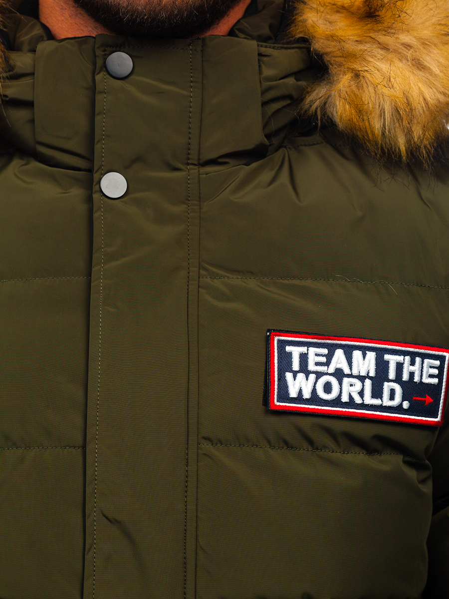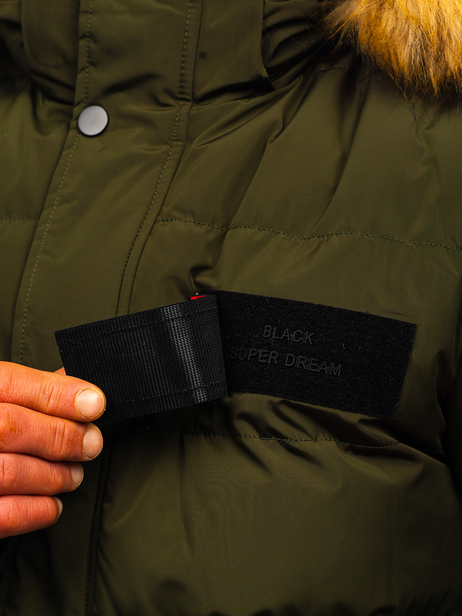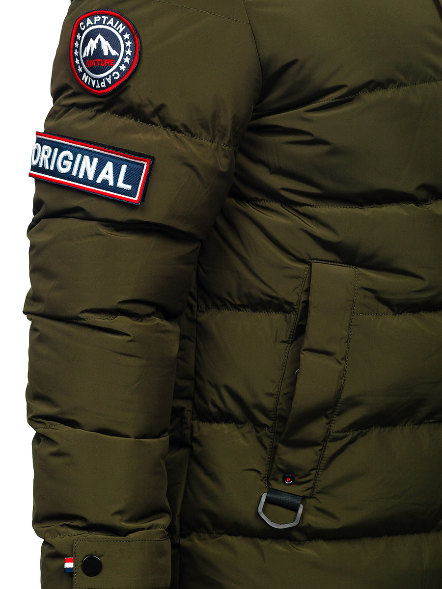 Khaki színű, hosszú, steppelt téli férfi dzseki -Bolf 6476- klasszikus módon, cipzárral és patenttal zárható. Álló típusú gallérral, levehető kapucnival, mely tökéletesen véd a szél és az eső elől. A kapucninál levehető szőrme található. Az idomuló és egyenes szabásának köszönhetően benne mindenki különlegesnek látszik. Karakterét adekoratív nyomatok a mellkason és az ujjon adjákA dzseki két oldalsó, patentos zsebbel és egy belső, gombolható zsebbel rendelkezik. Tépőzárral állítható ujjakkal,belülről passzéval van ellátva,ennek köszönhetően jól idomul az alakhoz és véd a hideg elől.Megfelelő sétára, baráti találkozásra vagy városi kiruccanásra. Ez a dzseki tökéletes párosítást alkot farmerralés klasszikus pulóverrel.