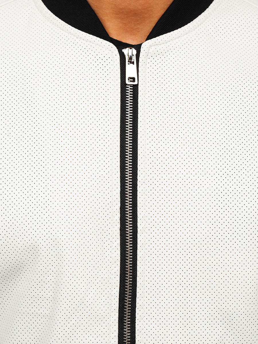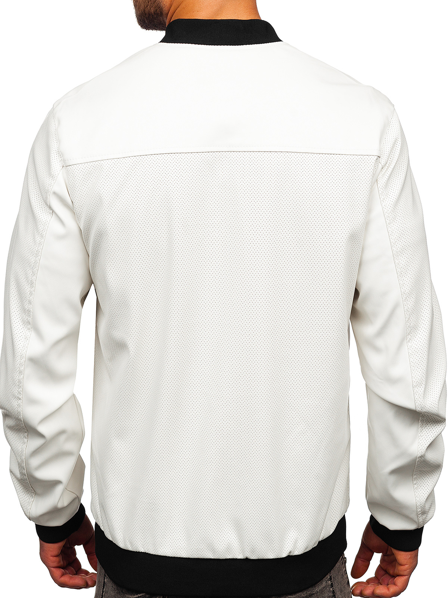 Fehér színű, férfi bőrdzseki - Bolf 7110- klasszikus, egyenes szabású. Cipzározható termék, álló típusú gallérral rendelkezik, mely passzés.. A két cipzározható, külső zseb és egy belső zseb praktikussá teszi. Az alsó rész és az ujjak szűkítővel vannak ellátva, ennek köszönhetően melegen tart és véd a szél elől.. Bőrdzseki univerzális szabású és casual stílusú, tökéletes különböző alkalmakra. Kétféle anyagból varrott, ökobőrből.Nagyszerűen mutat párbanjoggerrel,farmerral vagy kissé lazább stilizációkban melegítőnadrággal.