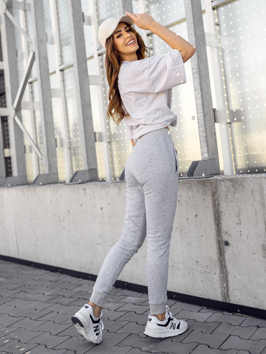 Szürke melanzs színű, női melegítőnadrág -Bolf CK-01- slim szabású klasszikus nadrág, mely szépen kiemeli a női alakot. Ez a nadrág modell több színben kapható. A nadrág állítható derékban megkötővel és szűkítővel és két zsebe van elöl. Sportos kinézetet az egyenes fazon biztosít és a szűkítők a lábszárakon. Finom, kellemes tapintású melegítőanyagból készült termék.