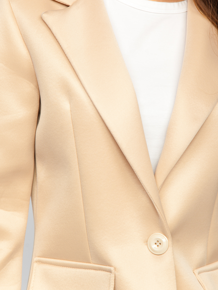 Bézs színű, rövid női kabát -Bolf 20672- tökéletes választás a hűvösebb napokra. Rövid, gombos kabát, eleganciát biztosít a stilizációnak. Divatos kinézetet az oldalsó, zsebfedős zseb imitáció biztosít és a rewers típusú gallér. Egy különleges kabát egyenes fazonú, félelegáns stílusú. A legmagasabb minőségű anyagból készült termék, ami rugalmassá és kényelmessé teszi őt. Időtálló szabásnak köszönhetően a kabát több szezonon keresztül viselhető. Ugyanúgy megállja a helyét hétköznapi öltözetekben, mint formálisabb stilizációkban. Káprázatosan fogsz kinézni benne női egyrészes ruhával párosítva!